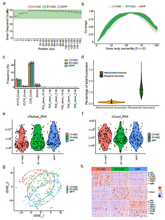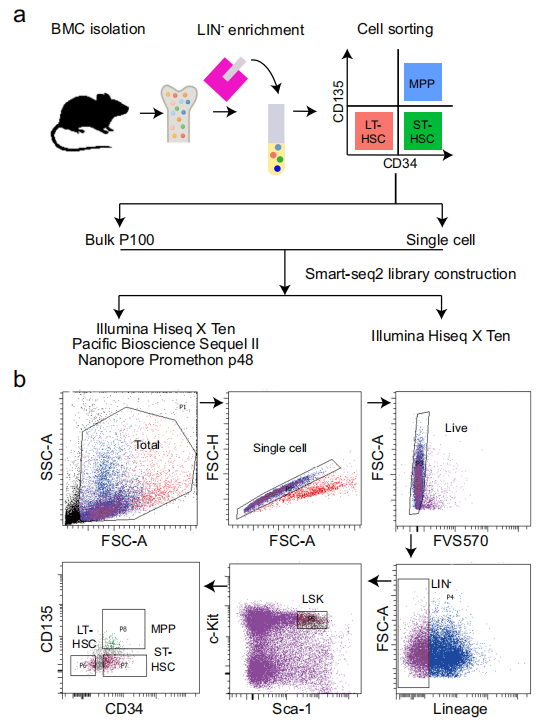 樣本制備:8-9周的雌性成年C57BL/6 J 小鼠,從股骨和脛骨中分離骨髓細胞。首先使用小鼠造血干細胞分離試劑盒富集造血干細胞和祖細胞(HSPC)。長期(LT)和短期(ST)造血干細胞(HSC)和多能祖細胞(MPP)根據(jù)其表面標志物進行分選。對于單細胞RNA測序(scRNA-seq),將細胞單獨分選到含有裂解緩沖液的8條PCR管中。同時對于批量RNA-seq,分選100個細胞(P100)到一個PCR管中作為生物學重復。