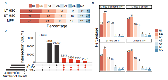 利用短讀長下一代測序(NGS)或長讀長測序(如PacBio和Oxford Nanopore Technologies)的RNA測序,是解讀包括血細胞生成在內(nèi)的各種生物過程中的轉(zhuǎn)錄多樣性和調(diào)控機制的強大工具。雖然NGS在表達定量方面更可靠,但是短讀長在AS事件中只能提供有限的信息。相比之下,長讀長的測序方法提供了一個獨特的機會,可以實現(xiàn)在提供全長信息的基礎(chǔ)上檢測可變剪接異構(gòu)體。本文使用短讀長和長讀長RNA測序,在批量和單細胞水平上對小鼠HSC和MPP進行了全面的轉(zhuǎn)錄圖譜分析。