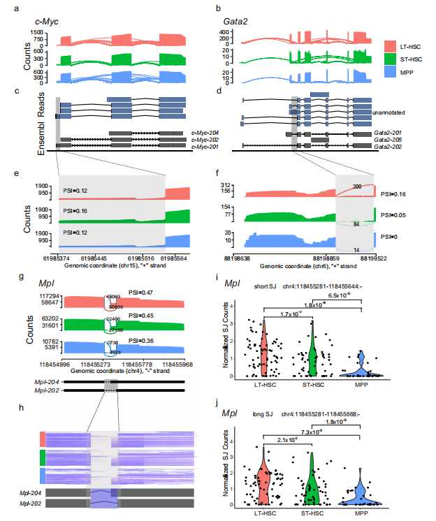 為了進一步確認長讀長在識別可變剪接異構(gòu)體方面的優(yōu)勢,使用納米孔和PacBio測序數(shù)據(jù)對三種細胞類型中已知的LT-HSC的標志物c-Myc和Gata2(圖2h)的轉(zhuǎn)錄本進行了可視化。接下來篩選了所有映射到基因c-Myc和Gata2及其注釋的轉(zhuǎn)錄本上的reads。發(fā)現(xiàn)2915個reads覆蓋到了c-Myc,且LT-HSC的reads數(shù)*多(圖6a)。在納米孔和PacBio測序數(shù)據(jù)中可視化了全長轉(zhuǎn)錄本的reads,發(fā)現(xiàn)所有注釋的亞型都能被鑒定識別(圖6c)。在c-Myc第一個外顯子中發(fā)現(xiàn)了一個5 ‘的可變剪接起始位點。使用短讀長測序數(shù)據(jù)來定量該基因座的剪接百分比(PSI),發(fā)現(xiàn)較長的異構(gòu)體在所有三種細胞類型中具有相似的 PSI(剪接百分比),ST-HSC中包含第一個外顯子的較長異構(gòu)體的reads占比比較高(圖6 e)。對于Gata2來說,發(fā)現(xiàn)覆蓋有595個reads,在LT-HSC中比其他兩種細胞類型多了近20倍的reads數(shù)(圖6b)。通過對比全長reads和注釋的轉(zhuǎn)錄本,發(fā)現(xiàn)在LT-HSC中Ensembl的轉(zhuǎn)錄本中有一個未注釋的內(nèi)含子保留(圖6d)。隨后利用短讀長測序數(shù)據(jù)驗證驗證了這種內(nèi)含子保留并定量這個內(nèi)含子的PSI值,發(fā)現(xiàn)該內(nèi)含子在LT-HSC中PSI值*高(圖6f)。接下來展示將長讀長測序與單細胞RNA-seq結(jié)合的數(shù)據(jù)示例,從長讀長測序數(shù)據(jù)中鑒定到了一個在Mpl中具有24 bp可變剪接區(qū)域的可5’剪接位點(A5)?;赟mart-seq2的測序數(shù)據(jù)發(fā)現(xiàn)這個剪接事件在不同細胞類型中是差異的,其PSI值從LT-HSC,ST-HSC到MPP是依次遞減的(圖6g-j)。使用Smart-seq2數(shù)據(jù)可以觀察到單個細胞間的異質(zhì)性(圖6h),在造血過程中,所涉及的長和短剪接位點(SJ)是被顯著下調(diào)的(圖6i,j)。這些結(jié)果表明,整合短讀長和長讀長測序有助于識別差異表達的異構(gòu)體。