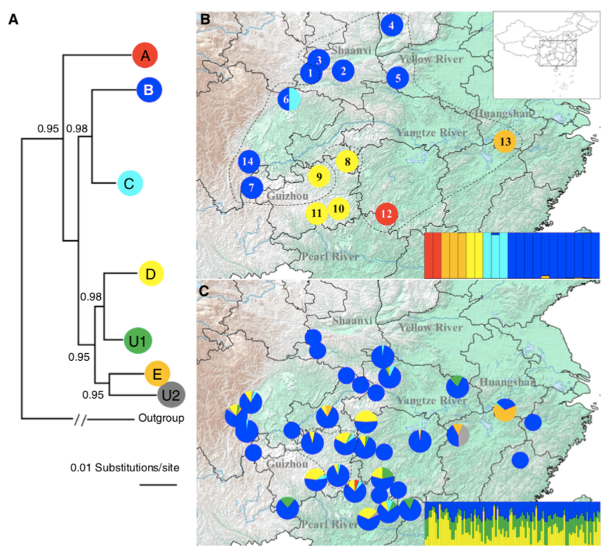 此外,2018年發(fā)表在Current Biology(IF = 10.814)的中國大鯢研究中,研究人員收集了70個野生地采集的1034個個體,通過SLAF-seq對中國大鯢的分類進行研究?;?3,159個SNPs位點和mtDNA的野生采集個體的遺傳多樣性分析顯示:中國大鯢至少具有5個明顯的分群(圖3)。此外還有一些未被鑒定的種(圖3:U1,U2)。譜系A(chǔ)-E,在4.71-10.25Mya間開始分化,并與河流排水相關(guān)?;谵r(nóng)場育種的中國大鯢個體的mtDNA和微衛(wèi)星序列的遺傳多樣性分析顯示其具有廣泛的遺傳混合,特別是,漸滲種類B來自陜西黃河流域。通過農(nóng)業(yè)混種導(dǎo)致了分化于四百萬年前的中國大鯢發(fā)生了雜交,這種雜交方式不足為奇,另有研究報道過在日本本土,中國大鯢的引種和日本大鯢發(fā)生了雜交。