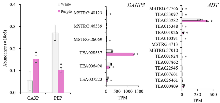 為了進(jìn)一步揭示兩個茶樹品種之間BPs的不同合成機(jī)制,檢測了上游化合物和基因(圖5)。在紫色花瓣中,3-磷酸甘油醛(GA3P)增加了2.9倍,而磷酸烯醇式丙酮酸(PEP)僅為白色花瓣的38%,這表明紫色花瓣中的碳代謝被促進(jìn),但它可能不會進(jìn)入苯丙氨酸的下游代謝。PEP的降低可能是由于高度誘導(dǎo)的3-脫氧-D-阿拉伯庚糖酸7-磷酸合成酶(DAHPS)所致。在紫色花瓣中,DAHPS基因的主要成員TEA028537的表達(dá)量高出4.6倍。芳醇脫水酶/預(yù)苯酸脫水酶(ADT)催化芳醇生成苯丙氨酸。它的主要成員TEA033282在紫色花瓣中略微升高,高出1.3倍。此外,合成的花青素在顯示顏色之前需要運(yùn)輸?shù)揭号葜?,該過程與谷胱甘肽S-轉(zhuǎn)移酶(GST)、多藥耐藥相關(guān)蛋白(MRP)以及多藥和毒素擠壓(MATE)有關(guān)。把這些顯著差異基因的表達(dá)量加起來,發(fā)現(xiàn)紫色花瓣的總表達(dá)量都較高,分別高出1.1, 1. 3和1.7倍。紫色花瓣中這三個基因的主要成員(TEA015341、TEA001531和TEA006958),表達(dá)量分別高出6.9, 1. 4,和3.9倍。