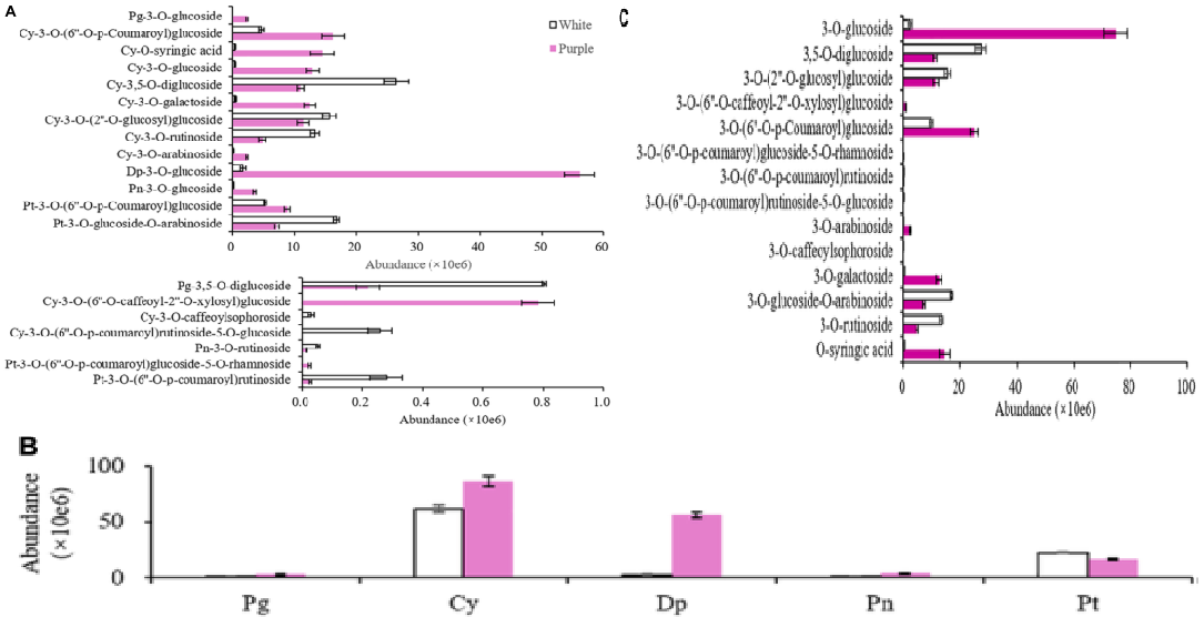 Dp只有一種糖苷形式,但它在紫色花瓣中含量豐富。紫色花瓣中的主要花色苷是delphinidin-3-O-glucoside,Cy-3-O-(6’’-O-p-coumaroyl)glucoside, ?Cy-O-syringic ?acid, Cy-3-O-glucoside和Cy-3-O-galactoside,?而在白色茶花中,則是 Cy-3,5-O-diglucoside, Pt-3-O-glucoside-O-arabinoside,? Cy-3-O-(2’’-O-glucosyl)glucoside和 Cy-3-O-rutinoside 。除苷元外,這20種花青素中的另一半含有13種糖苷和1種丁香酸(圖3C)。在白色花瓣中,花青素含量高的是3,5-O-二葡萄糖苷,而在紫色花瓣中,3-O-葡萄糖苷含量極高。因此,兩個茶樹品種之間花青素的大差異是DpG,這可能是紫色花呈紫色的主要原因,以及紫色花瓣中Dp和葡萄糖的生物合成可能已增強(qiáng)。