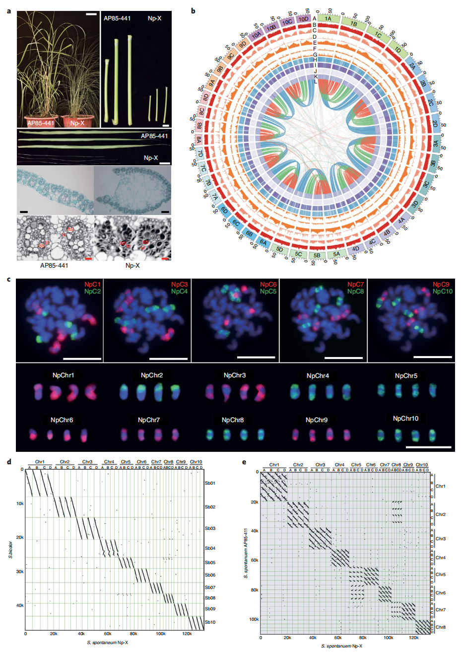 甘蔗屬是具有重要經(jīng)濟價值的作物,但其遺傳背景極其復雜,限制了甘蔗的進一步育種改良。具有廣泛分布的甘蔗細莖野生種割手密(S. spontaneum)為現(xiàn)代栽培種甘蔗貢獻了抗逆、分蘗等優(yōu)良性狀,實現(xiàn)了甘蔗的育種史上大的突破。割手密倍性和染色體基數(shù)的廣泛變異是甘蔗育種重要的種質資源,為研究植物同源多倍體基因組的進化提供了一個良好的模型。如何將天然同源四倍體的四套同源基因組完整組裝?不同倍性與染色體基數(shù)如何演化?這都是甘蔗基因組研究有趣和重要的地方也是難以攻破之處。本次研究在構建高質量基因組的基礎上進一步解析了甘蔗復雜的演化之路:(1)本次研究完成了割手密 Np-X(2n=4x=40)高質量同源多倍體基因組測序,完整的組裝了10組同源染色體的共40條染色體基因組。(2)Saccharum中的一對古復制染色體NpChr5和NpChr8經(jīng)歷了分裂,隨后融合并伴隨著著絲粒分裂。重組時帶有著絲粒結構的染色體片段融合入另外一條完整的染色體,導致x = 8中出現(xiàn)“雙著絲?!爆F(xiàn)象。(3)甘蔗分別在6.4 Mya和4.0 Mya時與高粱和芒草發(fā)生分化。在甘蔗中,割手密與S. officinarum在~1.6 Mya發(fā)生分化,兩個割手密材料Np-X(x=10)和AP85-441(x=8)在~0.8 Mya分化,表明AP85-441中的染色體減少是最近發(fā)生的。比較基因組結合轉錄組共同解析兩個甘蔗種“近期”獨立分化的且與糖分代謝、生物量、光合等相關的基因,為甘蔗的分子輔助育種提供重要的理論指導。(4)研究推斷Np-X(x=10)有可能代表祖先的核型,核型x=9和x=8可能是以逐步方式進化而來。割手密起源于印度北部的一個x=10的祖先,然后傳播到印度次大陸、中國和東南亞的四個主要群體。在染色體減少過程中,基因組中受自然選擇區(qū)可能參與多糖代謝和脅迫耐受過程。