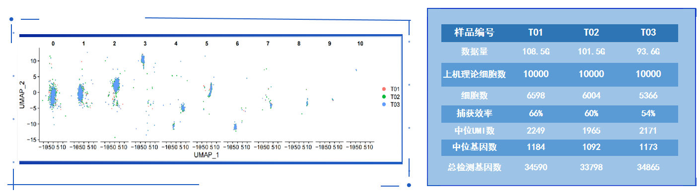 PBMC重復(fù)性檢測(cè):將相同的PBMC細(xì)胞懸液分3份,通過(guò)3個(gè)不同實(shí)驗(yàn)人員,用3臺(tái)百創(chuàng)DG1000儀器,獨(dú)立進(jìn)行單細(xì)胞測(cè)序,得到了幾乎一致的細(xì)胞聚類分群結(jié)果,證明百創(chuàng)DG1000具有很好的可重復(fù)性及穩(wěn)定性(圖5)。
