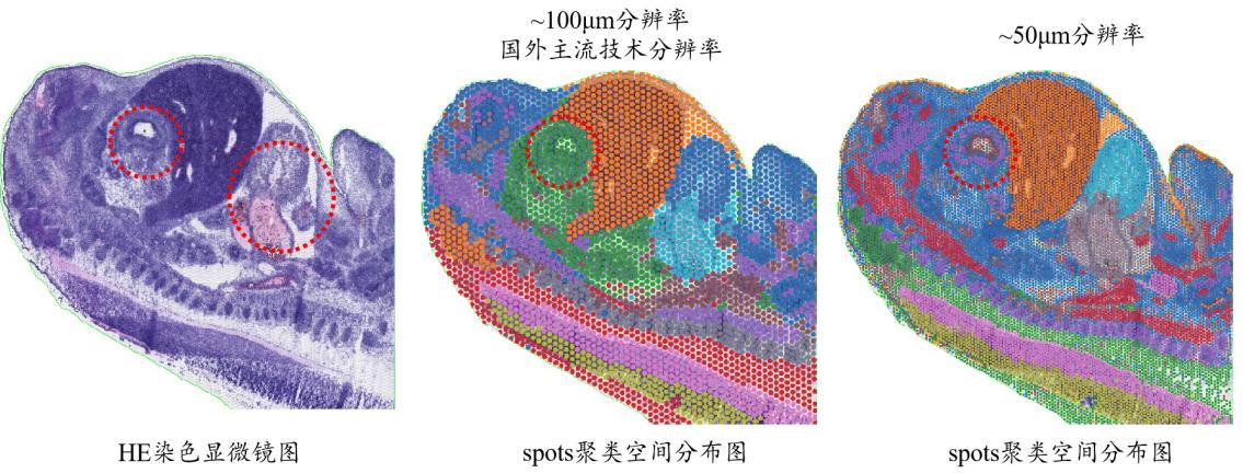 大鼠胚胎亞細(xì)胞分辨率實(shí)測(cè)數(shù)據(jù)展示:與100μm分辨率(主流技術(shù)平臺(tái))對(duì)比,高分辨率(~50μm)下HE染色組織形態(tài)學(xué)與spots聚類空間分布圖重合度更高,精準(zhǔn)識(shí)別空間基因表達(dá)的異質(zhì)性和組織區(qū)域的特異性(圖7)。