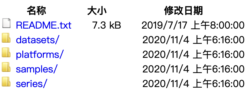 d)?GEO Dataset (GDS) 數(shù)據(jù)集的ID號(hào)這些數(shù)據(jù)均可以在ftp(ftp://ftp-trace.ncbi.nih.gov/geo/)進(jìn)行下載。一般我們?cè)谖恼轮锌吹降亩际荊SE的ID,那我們?nèi)绾瓮ㄟ^(guò)GSE的ID進(jìn)行數(shù)據(jù)的下載呢,下面就讓小編手把手教您如何進(jìn)行GEO數(shù)據(jù)的下載。