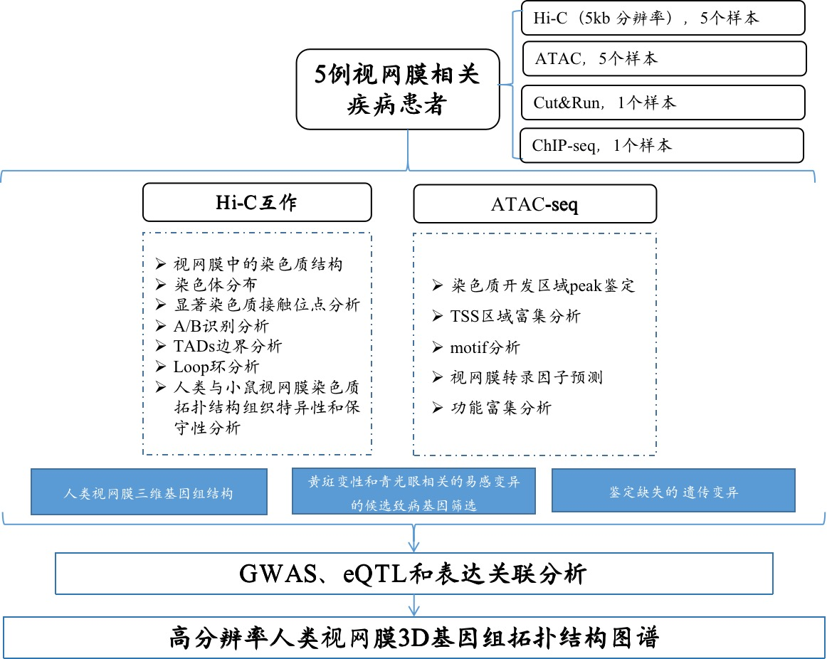 材料:一共取材5名患者捐贈視網(wǎng)膜組織(2名女性,3名男性,年齡65-77歲);Hi-C互作取3名男性和1名女性視網(wǎng)膜組織以及HCT116細胞系;CUT&RUN取1名75歲的女性外周視網(wǎng)膜組織;ATAC-seq取2名女性和3名男性視網(wǎng)膜組織。