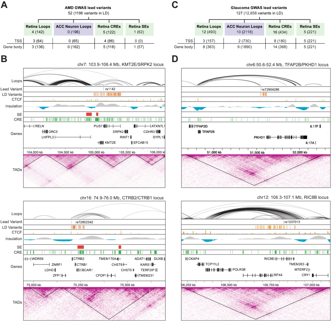 2)視網(wǎng)膜調(diào)控基因組拓撲結(jié)構(gòu)與AMD和青光眼相關(guān)遺傳變異的首次詳細整合;
