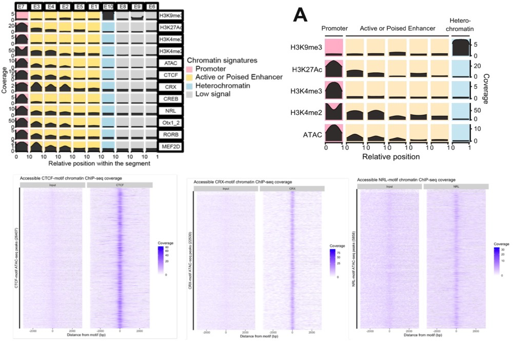 染色質(zhì)互作形成的loops促進CRE與其目標(biāo)基因之間的物理相互作用,并且在控制基因表達方面發(fā)揮著至關(guān)重要的作用。為了識別視網(wǎng)膜CRE,利用染色質(zhì)可及性檢測(ATAC-seq)確定了染色質(zhì)開放狀態(tài)和CUT&Run檢測活性(H3K4me3,H3K27Ac,H3K4me234)和抑制性(H3K9me3)組蛋白標(biāo)記互作的特征序列。通過全基因組染色質(zhì)開放程度以及開放區(qū)域(啟動子、增強子、異染色質(zhì)、低豐度信號)構(gòu)建了10種染色質(zhì)狀態(tài)模型,啟動子和增強子區(qū)域富集了用于結(jié)合CTCF和關(guān)鍵視網(wǎng)膜TF,如CRX、NRL、OTX2、MEF2D、CREB和RORB,另外增強子主要在TSS上游區(qū)域富集,而啟動子僅在TSS富集。