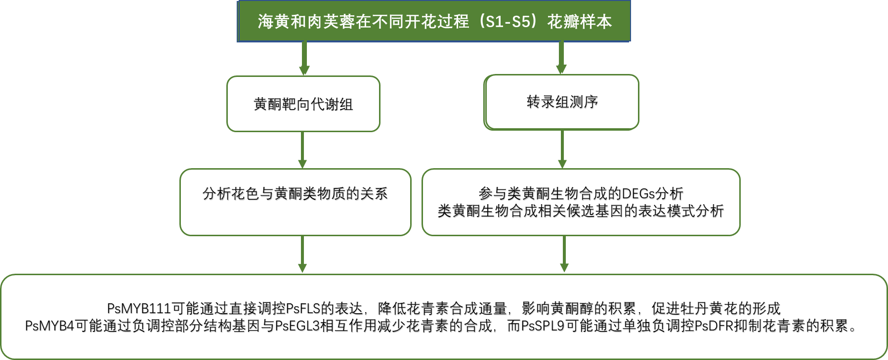 TF分析顯示調(diào)節(jié)黃酮類生物合成的TF基因都在具有黃色花的“海黃”品種中上調(diào),MYB和bHLH是調(diào)節(jié)植物黃酮類生物合成的關(guān)鍵轉(zhuǎn)錄因子TFs。該研究鑒定了幾個差異表達的MYB和bHLH轉(zhuǎn)錄因子,每一個都與牡丹黃酮類的產(chǎn)生有關(guān)。其中,PsMYB4被鑒定為具有bHLH相互作用位點的負黃酮類調(diào)節(jié)劑,這意味著它們可能形成一個復雜的負調(diào)控網(wǎng)絡(luò)。研究發(fā)現(xiàn)PsMYB111通過單獨調(diào)節(jié)PsFLS促進黃酮醇的積累。此外,PsMYB4和PsEGL3可能形成復合物負調(diào)控部分結(jié)構(gòu)基因,而PsSPL9可能單獨負調(diào)控PsDFR,抑制花青素的產(chǎn)生,降低藍色著色。