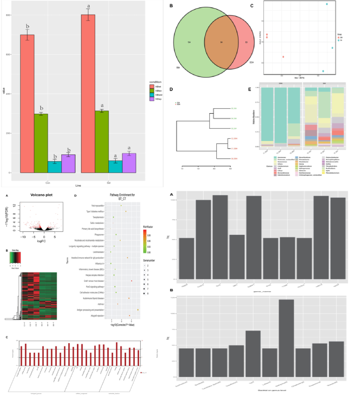 實(shí)驗(yàn)組和對(duì)照組之間的差異基因表達(dá):使用與16S測(cè)序相同的樣本對(duì)黃河鯉新品種(實(shí)驗(yàn)組)和對(duì)照組中的轉(zhuǎn)錄組進(jìn)行測(cè)序并鑒定差異基因(DEG)。在249個(gè)顯著DEGs中,194個(gè)基因表達(dá)下調(diào),55個(gè)基因表達(dá)上調(diào)。通過(guò)GO注釋,這些基因被分為以下功能類別:生物調(diào)節(jié)、細(xì)胞過(guò)程、解毒作用、發(fā)育過(guò)程、免疫系統(tǒng)進(jìn)程等(都屬于生物過(guò)程);細(xì)胞、細(xì)胞部分、胞外區(qū)域、胞外區(qū)域部分、大分子復(fù)合物等(細(xì)胞成分);抗氧化活性、結(jié)合活性、催化活性、分子功能調(diào)節(jié)器上等(分子功能)。聚類分析表明,實(shí)驗(yàn)組和對(duì)照組具有不同的特征,DEG分為四個(gè)部分,大部分基因注釋到了免疫相關(guān)途徑。