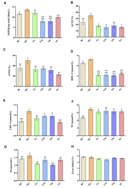 與空白組比較,模型組大鼠肝酶、血脂指標(biāo)升高,其中TC、HDL-C、LDL-C、AKP、ALT、AST差異有統(tǒng)計學(xué)意義,而甘油三酯則無顯著差異。給藥后肝酶和血脂均低于模型組。丙氨酸氨基轉(zhuǎn)移酶(ALT)、谷草轉(zhuǎn)氨酶(AST)和高密度脂蛋白膽固醇(HDL-C)在MC組和給藥組之間有顯著差異。各給藥組間TC、ALT、HDLc差異無統(tǒng)計學(xué)意義。HRG組與PC組比較,AKP、AST、TG、LDL-C差異有統(tǒng)計學(xué)意義。
