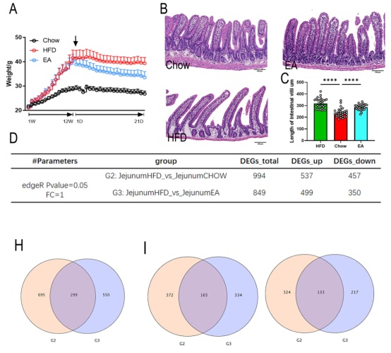 相較于HFD組,EA組顯示出顯著地減肥效果(圖2A),并減少了附睪、腎臟和腹股溝區(qū)域的脂肪堆積??漳c是腸道脂質(zhì)消化和吸收的主要區(qū)域,HFD小鼠的空腸絨毛明顯長(zhǎng)于食物組(圖2B, 2C)。HFD組和正常對(duì)照組間共鑒定出994個(gè)差異表達(dá)基因DEG(圖2D-F),HFD組和EA組共鑒定出849個(gè)DEG(圖2G);通過取兩個(gè)比較組共有的DEG,作為EA直接調(diào)控肥胖的DEG,共檢測(cè)到共有基因299個(gè),其中上調(diào)的有165個(gè),下調(diào)的有133個(gè)(圖2H-J)。