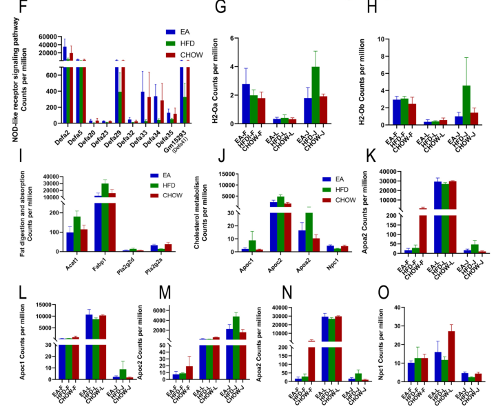 對(duì)共有DEG進(jìn)行功能富集分析,發(fā)現(xiàn)顯著富集的通路主要與宿主先天防御和脂質(zhì)代謝相關(guān)(圖3A);在去除功能未鑒定的基因或lncRNA后,獲得140個(gè)上調(diào)和92個(gè)下調(diào)的DEG也進(jìn)行功能富集分析(圖3B, 3C);然后,對(duì)top20通路的DEG進(jìn)行PPI調(diào)控網(wǎng)絡(luò)分析(圖3 D, 3E),結(jié)果顯示,EA主要上調(diào)的通路包括α防御素基因在內(nèi)的NOD樣受體信號(hào)通路(圖3 D),下調(diào)的通路脂質(zhì)代謝(包括脂質(zhì)消化和吸收途徑),以及免疫應(yīng)答相關(guān)通路(谷胱甘肽s-轉(zhuǎn)移酶和MHC II類相關(guān)基因)(圖3E)?;虮磉_(dá)直方圖顯示EA干預(yù)恢復(fù)大量異常表達(dá)的DEG,與腸粘膜免疫相關(guān)的DEG,如α防御素基因,可以通過EA顯著恢復(fù)(圖3F);與免疫反應(yīng)相關(guān)的H2-Ob和H2-OA僅在空腸區(qū)域下調(diào)(圖3G, 3H);EA干預(yù)恢復(fù)了fabp1、pla2g2d和acat1的表達(dá)水平,主要負(fù)責(zé)脂肪消化和吸收(圖3I);最后,EA干預(yù)通過下調(diào)apoc1、apoa2和apoc2以及上調(diào)npc1來調(diào)節(jié)膽固醇代謝(圖3J-O)。