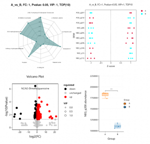 2、Z-score分析:Z-score是基于代謝物的定量值轉換而來的值,用于衡量實驗組相對于對照組的差異偏離情況。通過Z-score圖可展示不同兩組間差異代謝物的偏離情況。