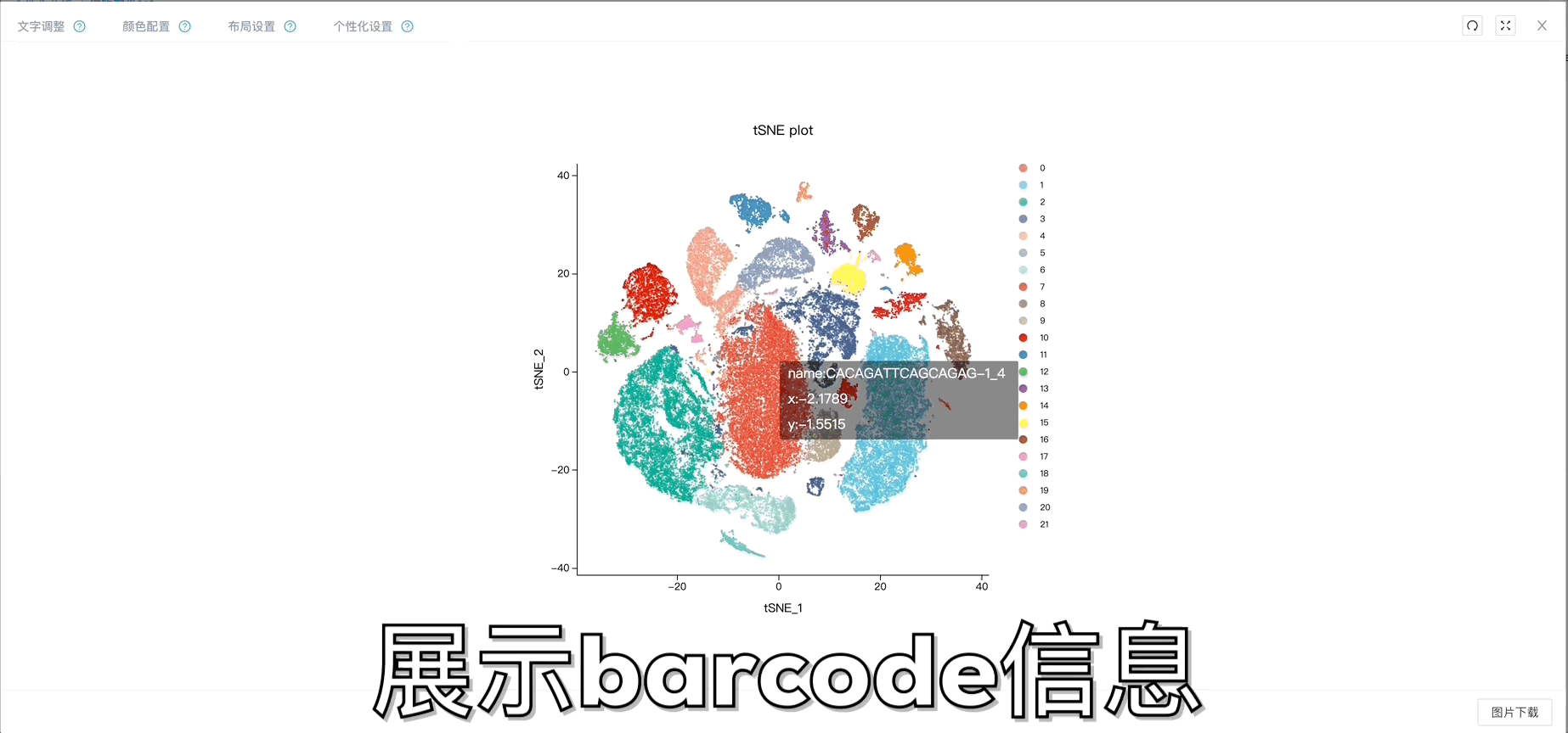 篩選到有效細胞后,可以基于細胞的基因表達矩陣,進行細胞聚類分析。細胞聚類交互圖可展示UMAP/TSNE圖,調(diào)整點的大小,點配色,文字等交互圖樣式可自定義,具體見下圖及圖中的描述。