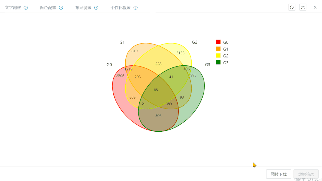 通常會對差異的基因/物質(zhì)做簡單的韋恩圖繪制,也可以對總體的基因/物質(zhì)進行繪圖。交互韋恩圖的功能非常靈活,2-5個分組自動繪制韋恩圖,5-32個自動為花瓣圖,支持經(jīng)典韋恩圖、齒輪圖的更換,還支持數(shù)字點擊進行下級數(shù)據(jù)的二次篩選交互。