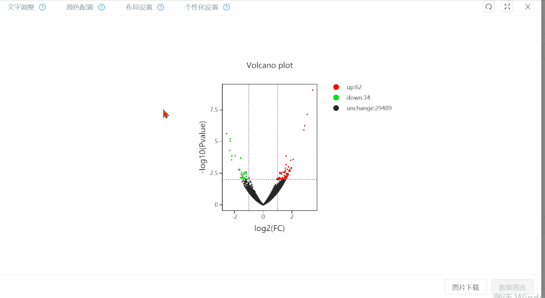 火山圖(Volcano Plot)可以快速地查看基因/物質(zhì)在兩個(組)樣品中表達水平的差異。火山圖的交互式支持自定義展示一定數(shù)目的重點差異基因,還支持支持選擇重點差異基因進行數(shù)據(jù)篩選,進行二次數(shù)據(jù)處理。