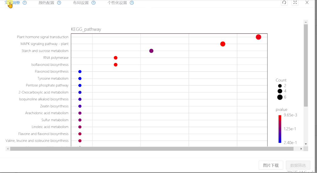 氣泡圖是富集分析后的重要展示手段,交互氣泡圖常用于GO和KEGG氣泡圖,支持Pvalue/Qvalue以及rich_factor/GeneRatio的自由切換,支持圖片選擇重點富集通路進行數(shù)據(jù)篩選,進行二次數(shù)據(jù)處理。