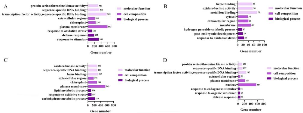 本研究對103份棉花材料在200mMCaCl2脅迫下萌發(fā),從103份棉花材料中篩選出一個極端抗Ca2+基因型(中9807,R)和一個Ca2+敏感基因型(CRI50,S)。然后將這兩份材料分別在0mMCaCl2和200mMCaCl2中發(fā)芽5天,然后取樣進(jìn)行轉(zhuǎn)錄組測序。形態(tài)學(xué)和生理學(xué)分析表明,在R中特異表達(dá)的PLR2可能通過促進(jìn)SDG的合成來增強(qiáng)棉花清除活性氧的能力。綜上所述,本研究提出了棉花應(yīng)對高鈣脅迫的適應(yīng)機(jī)制,有助于提高棉花的抗逆性。