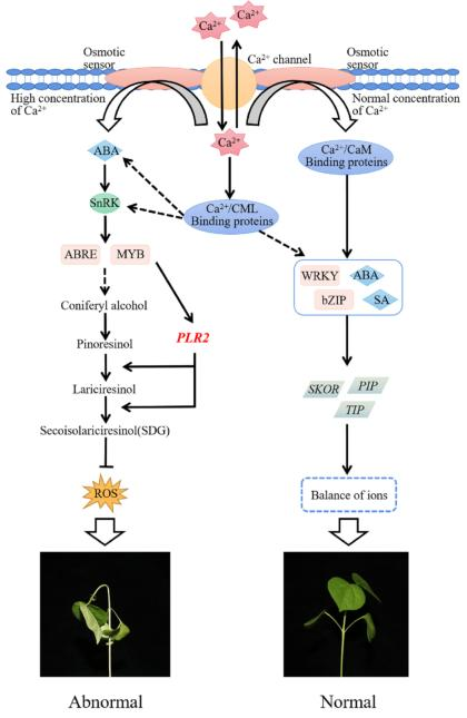 當(dāng)Ca2+從細(xì)胞外或液泡涌入細(xì)胞質(zhì)時,細(xì)胞質(zhì)中的Ca2+濃度會增加,Ca2+會與一些Ca2+受體蛋白CaM和CML結(jié)合,形成Ca2+/CaM(CML)結(jié)合蛋白。激活的Ca2+信號導(dǎo)致一些下游轉(zhuǎn)錄因子的表達(dá)增加,如WRKY和bZIP,通過調(diào)節(jié)細(xì)胞內(nèi)外水和離子的平衡,細(xì)胞在傳遞Ca2+信號后可以迅速恢復(fù)到低濃度Ca2+環(huán)境的狀態(tài)。同時,一些激素也受Ca2+信號的調(diào)節(jié),如ABA和SA,可以緩解棉花中的Ca2+瞬變。當(dāng)植物暴露于高濃度的Ca2+時,它們再也不能抵抗單獨(dú)由通道蛋白引起的大量Ca2+造成的損害。R將通過ROS清除機(jī)制與通道蛋白形成復(fù)雜的調(diào)節(jié)網(wǎng)絡(luò),共同緩解高Ca2+應(yīng)激。滲透受體感應(yīng)到Ca2+的增加,然后調(diào)節(jié)ABA的合成,激活A(yù)BA信號通路。首先,增加的ABA與PYL蛋白結(jié)合并與PP2C相互作用,通過SnRK促進(jìn)一些下游因子的磷酸化,并啟動ABA信號反應(yīng)。此時,編碼PLR2的轉(zhuǎn)錄因子ABRE和MYB被激活。然后,通過促進(jìn)松脂醇合成落葉松烯醇,落葉松烯醇合成SDG,從而提高活性氧的清除能力,從而增強(qiáng)棉花抵御高Ca2+脅迫的能力(圖4)。