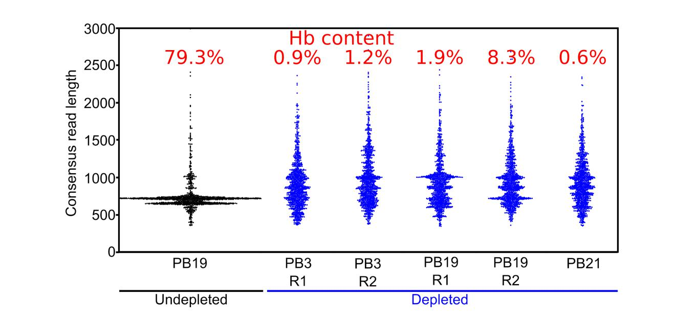 在2%瓊脂糖凝膠上觀察到已去除或未去除的血紅蛋白轉(zhuǎn)錄本cDNA。實(shí)際上,在任何損耗之前,本研究在瓊脂糖凝膠中觀察到位于700-800bp的非常強(qiáng)的條帶,這表明存在大量的HBA和HBB血紅蛋白轉(zhuǎn)錄本(圖2)。經(jīng)過(guò)耗盡,再擴(kuò)增和大小選擇,全長(zhǎng)cDNA產(chǎn)物再次可視化顯示假定的血紅蛋白條帶的去除(圖2)。在確認(rèn)血紅蛋白耗盡之后,這個(gè)cDNA就可以轉(zhuǎn)換成基于ONT和illumina的文庫(kù),每個(gè)方案都使用相同的cDNA。