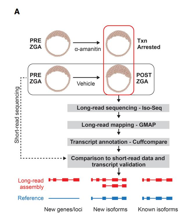 3、全長轉(zhuǎn)錄組測序:選取正常的胚胎和 RNA 聚合酶抑制劑α-鵝膏毒素處理的胚胎進 行三代全長轉(zhuǎn)錄組測序。