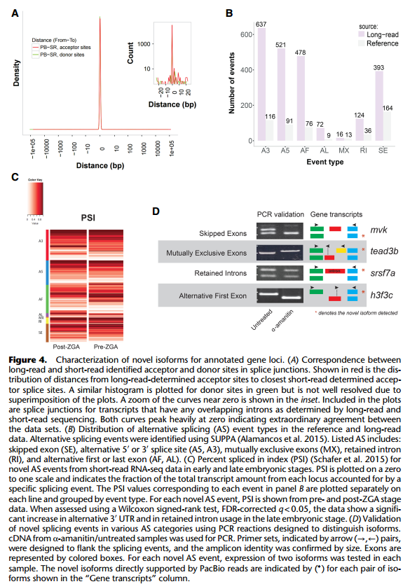 作者接著對全長轉(zhuǎn)錄組對已注釋基因鑒定到的未記錄的轉(zhuǎn)錄本的可變剪切形式的研究。 由于斑馬魚參考基因組對可變剪切的注釋較少,文章使用短讀長的轉(zhuǎn)錄組數(shù)據(jù)對可變剪切位 點進行驗證。作者使用 STAR 軟件分析轉(zhuǎn)錄組數(shù)據(jù),預(yù)測了 3000 個可變剪切位點,其中 99% 可以與全長轉(zhuǎn)錄本數(shù)據(jù)吻合。剪接位點的這種近乎完美的一致性支持證明了全長轉(zhuǎn)錄組鑒定 的外顯子 – 內(nèi)含子邊界的準(zhǔn)確性,并強烈支持新檢測到的可變剪接形式的有效性。通過全 長轉(zhuǎn)錄組共發(fā)現(xiàn)了 2000 種新型可變剪切類型,其中已注釋基因的新型可變剪切共 1835 中, 平均每個基因的可變剪切類型提升 50%。