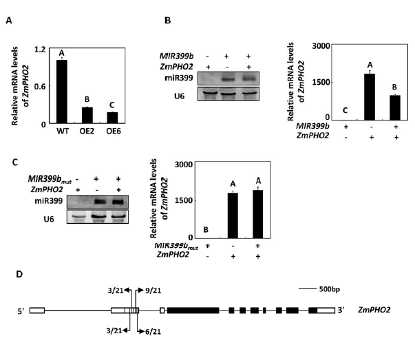 圖2:ZmPHO2被miR399轉(zhuǎn)錄后調(diào)控。A,qPCR檢測過表達(dá)轉(zhuǎn)化株的ZmPHO2轉(zhuǎn)錄本的表達(dá);B、C,通過northernblot檢測MIR399b/MIR399bmut和ZmPHO2在煙草中的表達(dá);D,通過5,RACE檢測ZmPHO2的切割位點(diǎn)