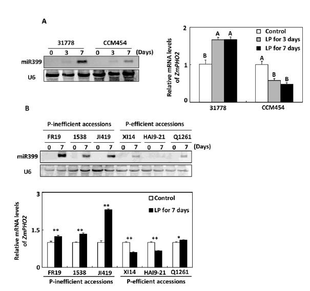 圖3:在磷高效和磷低效玉米株系中miR399的表達(dá)分析。A,在玉米自交系31778和CCM454中miR399和ZmPHO2轉(zhuǎn)錄本的表達(dá);B,在其他玉米株系中miR399和ZmPHO2轉(zhuǎn)錄本的表達(dá)