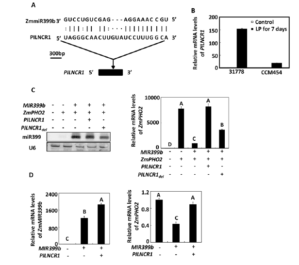 圖5:PILNCR1對ZmmiR399誘導(dǎo)的ZmPHO2切割的影響。A,玉米中PILNCR1與miR399b之間的互補(bǔ)區(qū)域示意圖;B,RT-qPCR實(shí)驗(yàn)驗(yàn)證在p缺乏條件下的磷高效玉米CCN454和磷低效玉米31778中PILNCR1的表達(dá);C,本氏煙中miR399、ZmPHO2、PILNCR1和PILNCR1del不同組合的共表達(dá);D,玉米葉片原生質(zhì)體中miR399和PILNCR1組合的共表達(dá)
