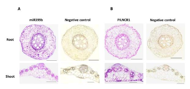 為了進(jìn)一步揭示ZmmiR399b和PILNCR1之間可能的關(guān)系,我們通過原位雜交驗(yàn)證ZmmiR399b和PILNCR1的表達(dá)模式。由于在磷充足條件下,ZmmiR399b和PILNCR1在玉米中的豐度比較低,于是去在pi缺乏條件下的第7天的玉米根和地上部分來驗(yàn)證ZmmiR399b和PILNCR1表達(dá)模式。ZmmiR399b和PILNCR1在玉米的根和地上部分均能被檢測到,尤其是在維管束里,見圖6A-B。這些結(jié)果顯示ZmmiR399b和PILNCR1的空間定位至少有部分是重合的。