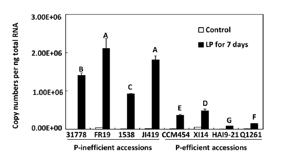 為了驗(yàn)證這些結(jié)果,我們還檢測了另外三株磷低效株系(FR19、1538、J1419)和三株磷高效株系(X114、HAI9-21、Q1261)的ZmmiR399的表達(dá),這些株系是通過560個(gè)株系中鑒定出來的。如圖3B,其結(jié)果與在31778和CCM454中是一致的,除了Q1261以外。在磷缺乏處理7天后,ZmPHO2轉(zhuǎn)錄本在磷高效株系中是下調(diào)的,在磷低效株系中是上調(diào)的。