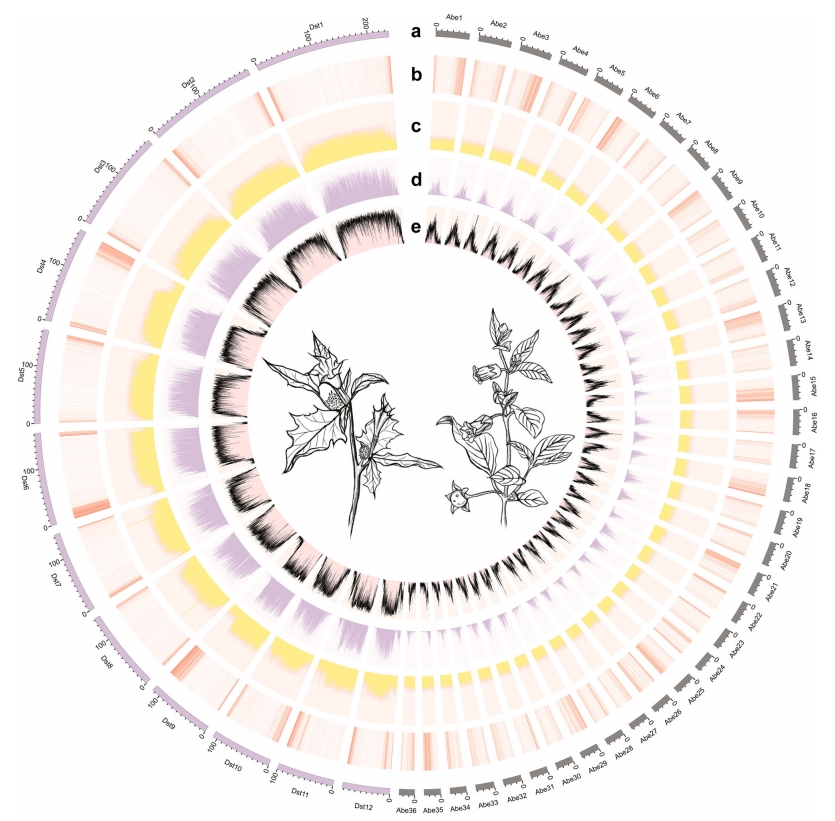 本研究基于三代PacBio、Nanopore、Hi-C等技術(shù)成功構(gòu)建了2個具有代表性的產(chǎn)mTAs的物種:顛茄和曼陀羅染色體水平基因組。研究結(jié)果表明:它們在茄科中的親緣關(guān)系較遠,但這兩個物種產(chǎn)生mTAs的生物合成途徑是保守的。保守的基因簇和基因重復(fù)構(gòu)成了TAs在該科中廣泛分布的基礎(chǔ),導(dǎo)致mTAs的分支基因可能在茄科早期祖先物種中進化,但在大多數(shù)譜系中都已丟失,顏茄和曼陀羅是例外。此外,研究還鑒定了一種細胞色素P450,它能將莨若堿修飾成去甲莨菪堿。此研究結(jié)果為了解茄科植物中TAs的生物合成提供了基因組學(xué)基礎(chǔ),并將有助于通過合成生物學(xué)方法進行mTAs的生物技術(shù)生產(chǎn)。