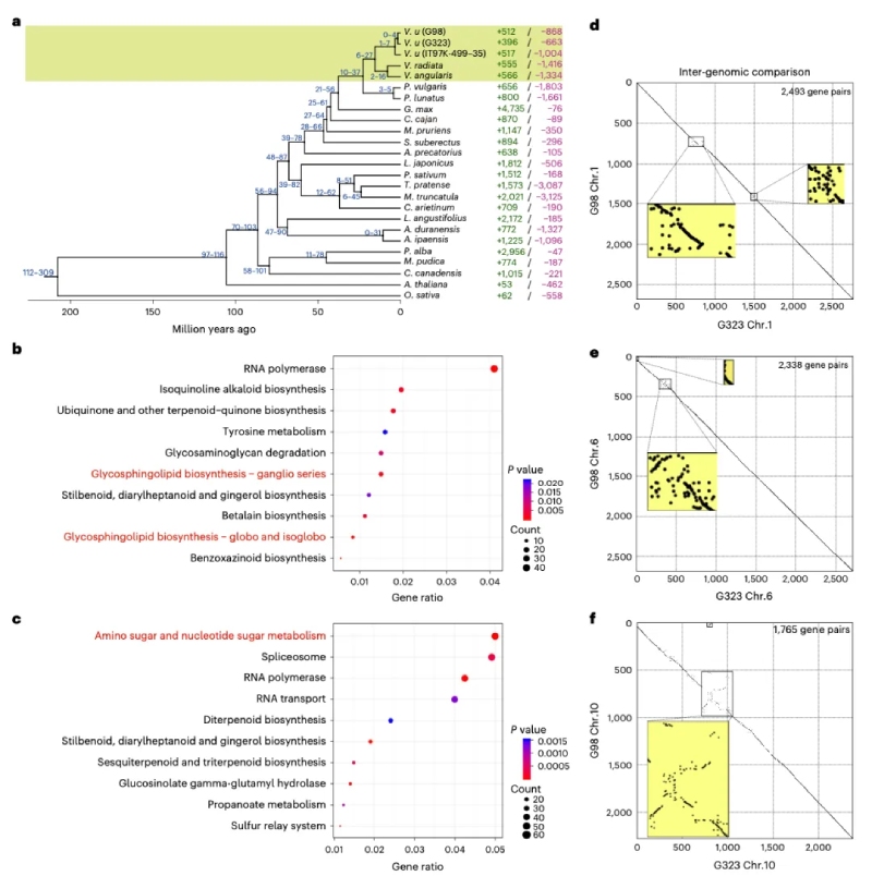 對25個物種進行系統(tǒng)進化樹分析顯示豇豆與赤小豆(V. angularis)和綠豆(V. radiata)親緣關(guān)系較近,它們的分化時間大約在6-27百萬年前(圖2a),這與之前的報道一致?;蚣易宸治霭l(fā)現(xiàn)G98中有512個家族發(fā)生了顯著擴張,這些擴張的基因家族在參與膜組織的鞘糖脂代謝途徑顯著富集,可能與菜用豇豆的豆莢發(fā)育相關(guān)。相反,G323擴張基因在氨基酸糖和核苷酸糖代謝、硫代葡萄糖苷-谷氨酰水解酶和半乳糖代謝等能量產(chǎn)生和轉(zhuǎn)化途徑中顯著富集(圖2b, c),這可能與糧用豇豆更高的碳水化合物積累和防御反應(yīng)有關(guān)。