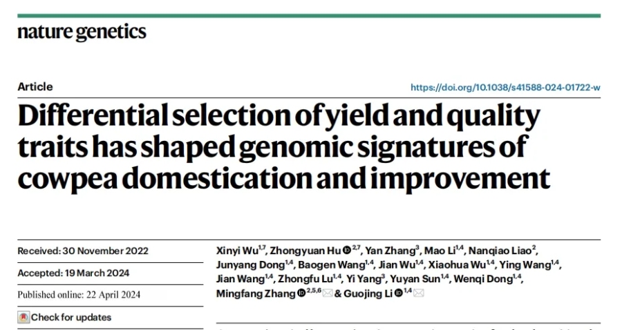 參考文獻:Wu, X., Hu, Z., Zhang, Y. et al. Differential selection of yield and quality traits has shaped genomic signatures of cowpea domestication and improvement. Nat Genet (2024).