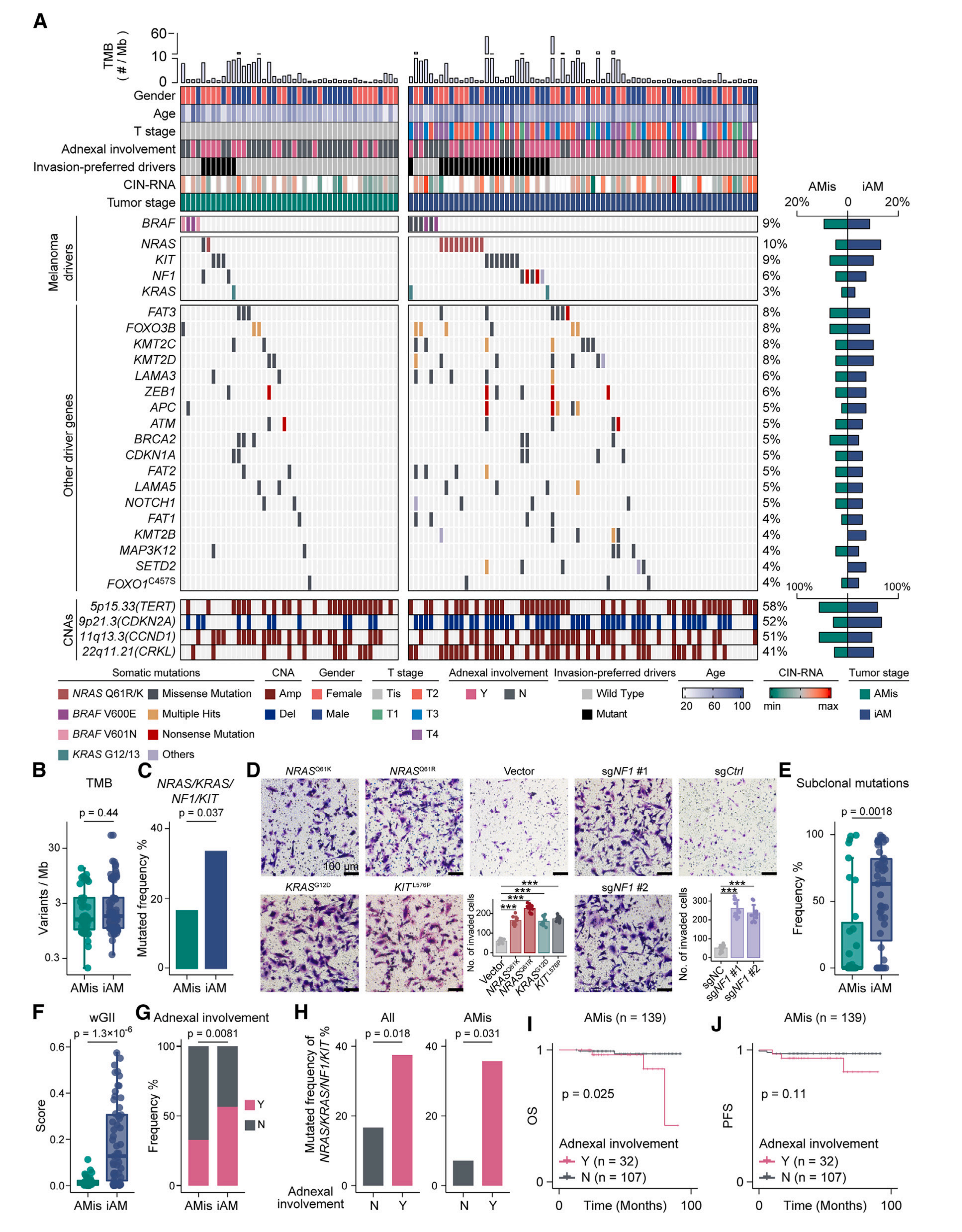 AMis和iAM的轉(zhuǎn)錄組學(xué)比較顯示在iAM中富集細(xì)胞外基質(zhì)(ECM)組織、EMT、KRAS、巨噬細(xì)胞遷移和干擾素γ (IFNγ)?通路,暗示AM侵襲期間TME失調(diào)??偟膩碚f,驅(qū)動突變、基因組不穩(wěn)定性和TME改變共同作用有助于AM侵襲。另外,研究人員還發(fā)現(xiàn)附屬器受累也與AMis的驅(qū)動突變及侵襲能力密切相關(guān)。