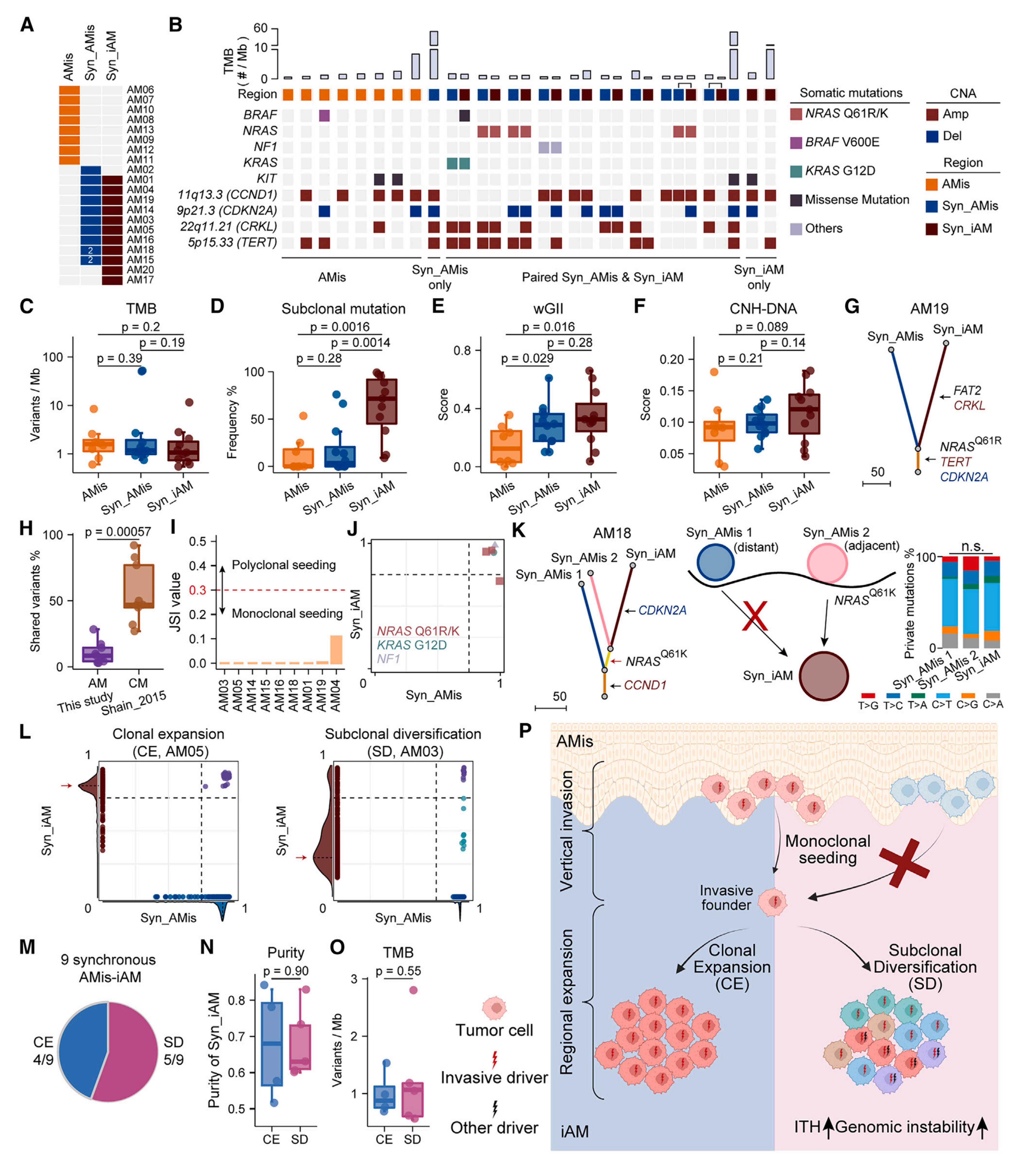 為了確定AM垂直侵襲的驅(qū)動機(jī)制,研究人員首先描繪了AMis和iAM的基因組圖譜,并系統(tǒng)比較了兩者的點(diǎn)突變、拷貝數(shù)變異、突變負(fù)荷、突變印記、亞克隆突變及基因組不穩(wěn)定性。分析結(jié)果表明iAM的亞克隆突變比例和基因組不穩(wěn)定性顯著升高。這種高度的基因組不穩(wěn)定性可能會加速腫瘤的發(fā)生并有助于獲得侵襲驅(qū)動突變。