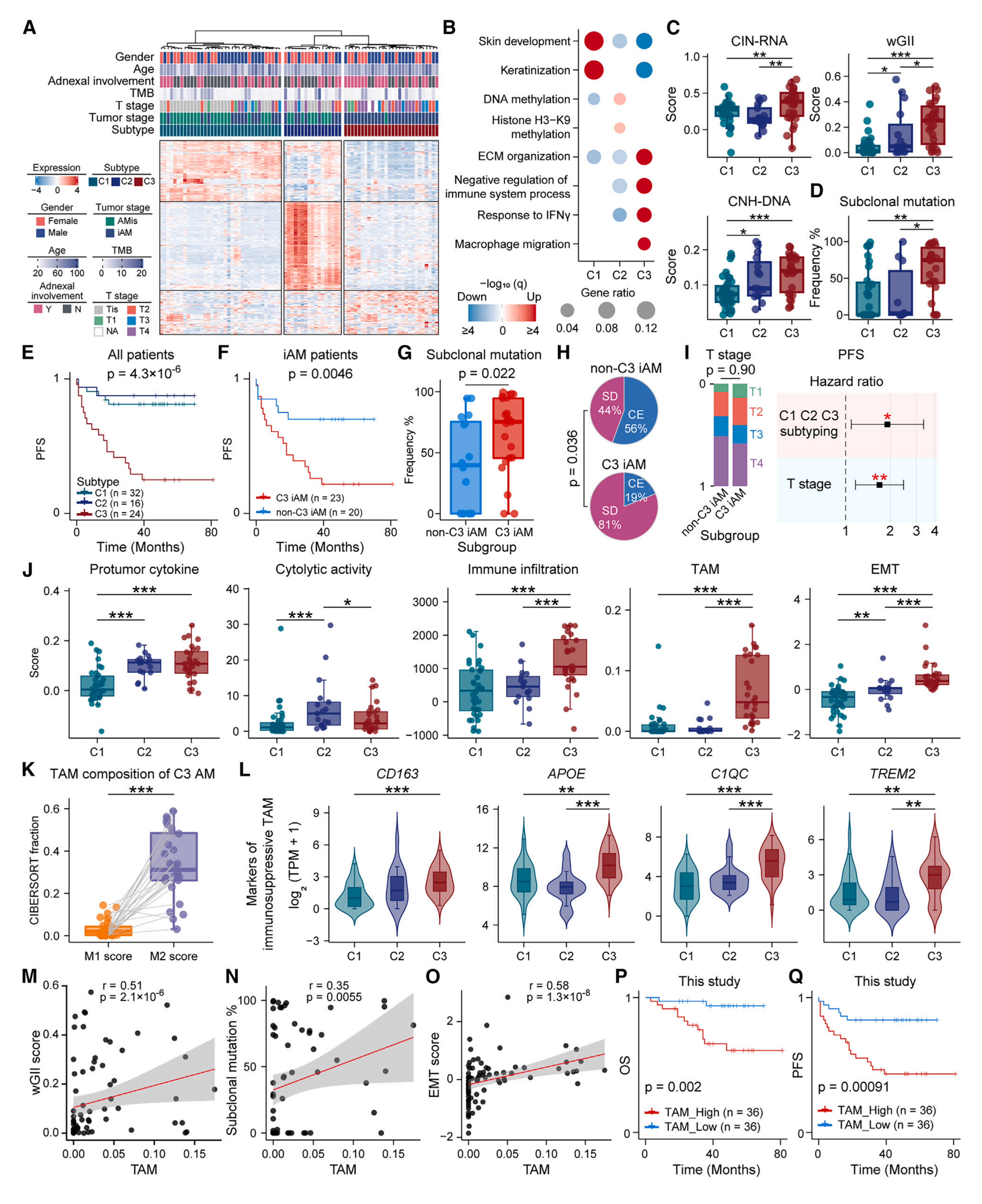 為了進(jìn)一步了解AM分子亞型,本文利用bulk RNA-seq對81名患者進(jìn)行檢測,確定C1、C2、C3三種分子亞型。C1亞型作為“角蛋白”亞型,C2亞型提示“染色質(zhì)重塑”表型,C3亞型表現(xiàn)出“增殖”表型。C3亞型亞克隆突變比例最高,且預(yù)后最差。其中C1和C2是均勻混合AMis和iAM,C3亞型高度富集iAM,表明iAM是一個獨(dú)特的子集。與非C3 iAM(C1和C2 iAM)相比較,C3 iAM表現(xiàn)為PFS縮短和明顯的惡性現(xiàn)象類型,尤其值得注意的是C3 iAM表現(xiàn)出顯著性更多的亞克隆突變。同時發(fā)現(xiàn)C3亞型表現(xiàn)出較高水平的免疫浸潤、腫瘤相關(guān)巨噬細(xì)胞(TAM)和EMT,而通過這三種AM分子亞型來看腫瘤負(fù)荷與TAM評分是相互獨(dú)立的。相比之下,TAM評分與基因組不穩(wěn)定性相關(guān),包括wGII和CNH-DNA評分以及亞克隆突變。此外, TAM評分與EMT評分相關(guān)和預(yù)后差。這些結(jié)果共同表明TAM的浸潤可能會促進(jìn)C3的腫瘤EMT和基因組不穩(wěn)定性并導(dǎo)致預(yù)后不良。