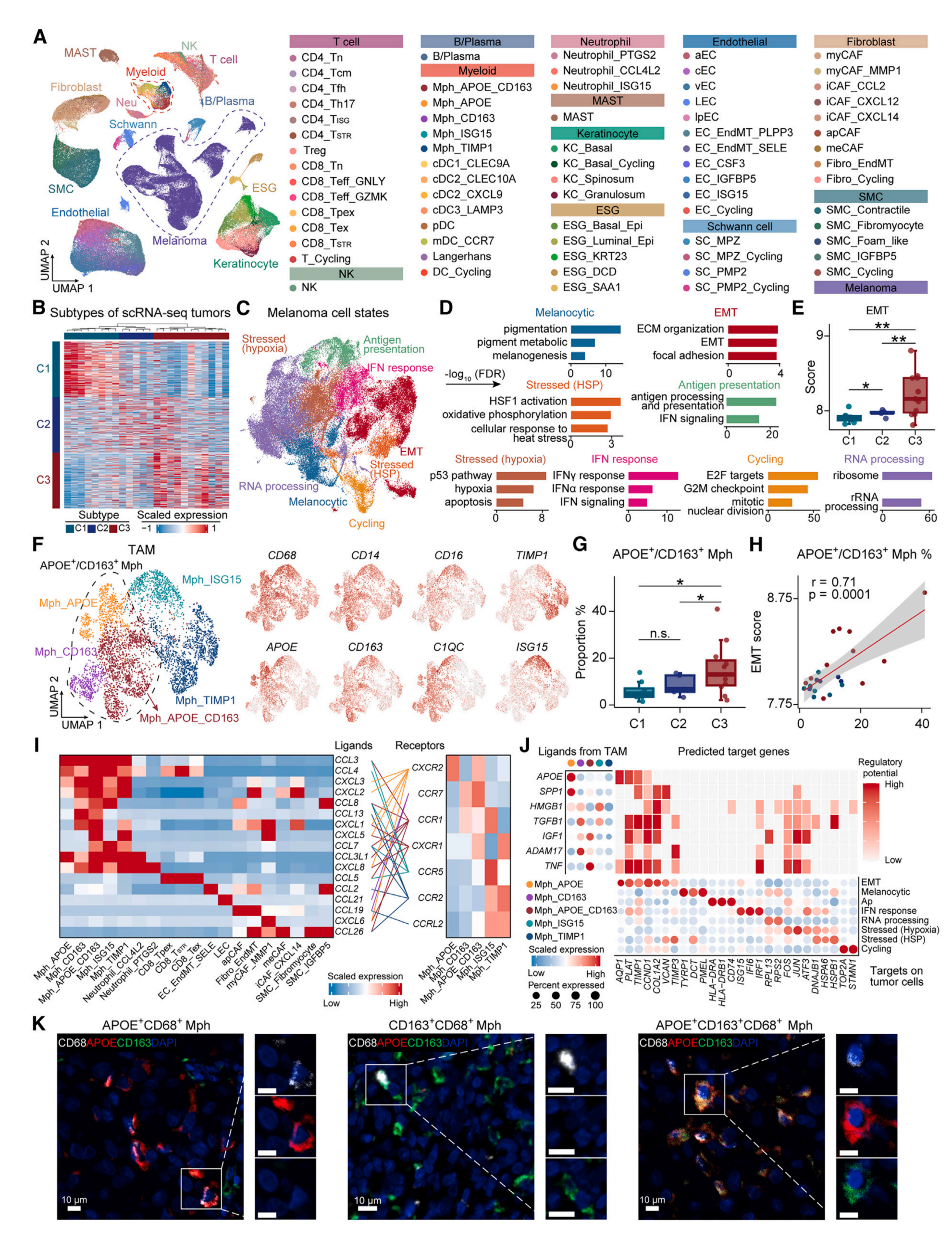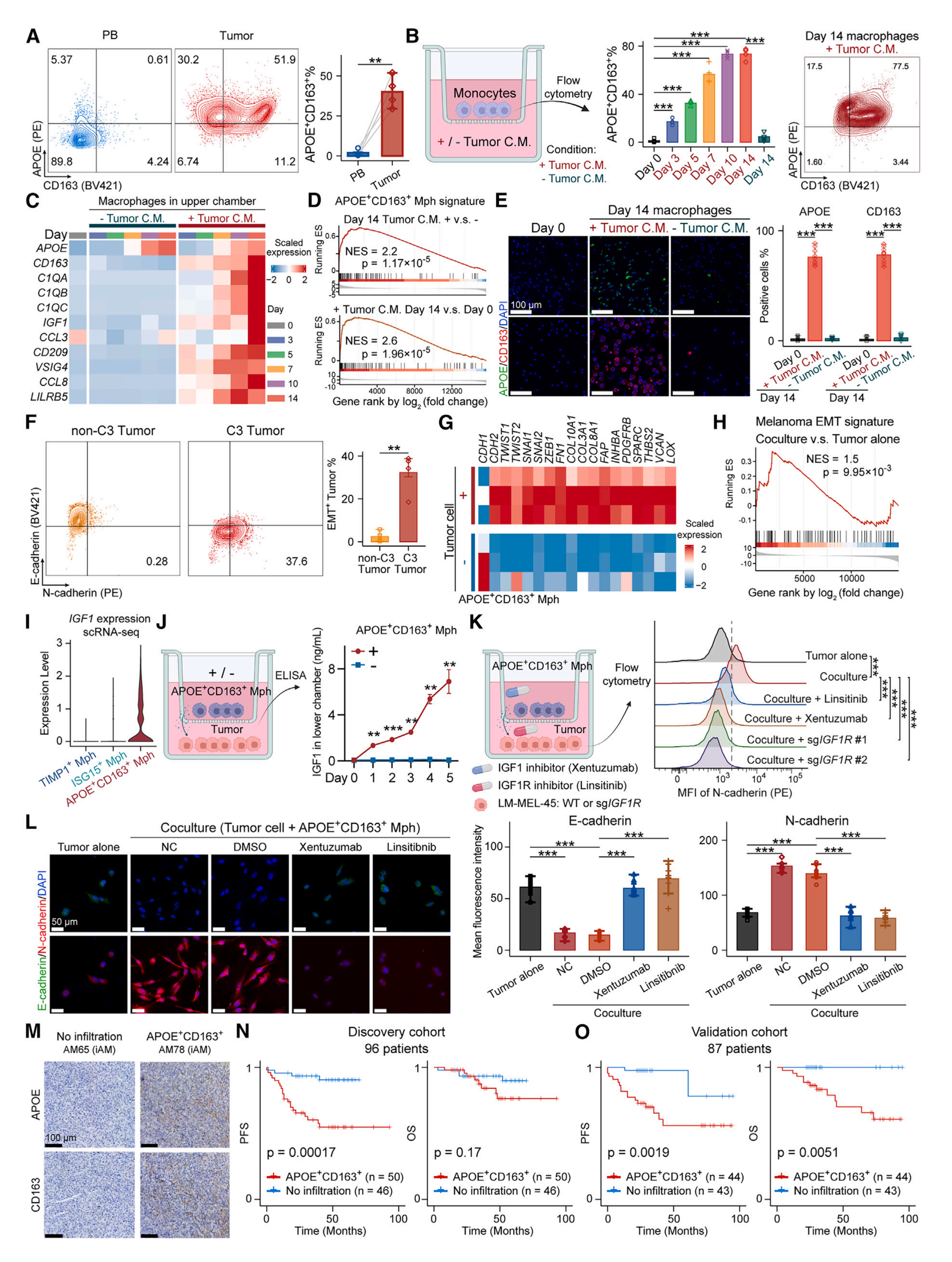 驗(yàn)證實(shí)驗(yàn):流式分選巨噬細(xì)胞(AM患者腫瘤組織和配對外周血,n=4);健康供體外周血單核細(xì)胞和 LM-MEL-45腫瘤細(xì)胞系C.M.共培養(yǎng)(0、3、5、7、10、14天,n=3);流式分選C3患者和非C3患者EMT腫瘤細(xì)胞(n=4);APOE+/CD163+巨噬細(xì)胞和腫瘤細(xì)胞共培養(yǎng)體系(n=3);LM-MEL-45腫瘤細(xì)胞系:野生型和IGF1R KO,IGF1抑制劑處理(xentuzumab),IGF1R抑制劑處理(linsitinib)