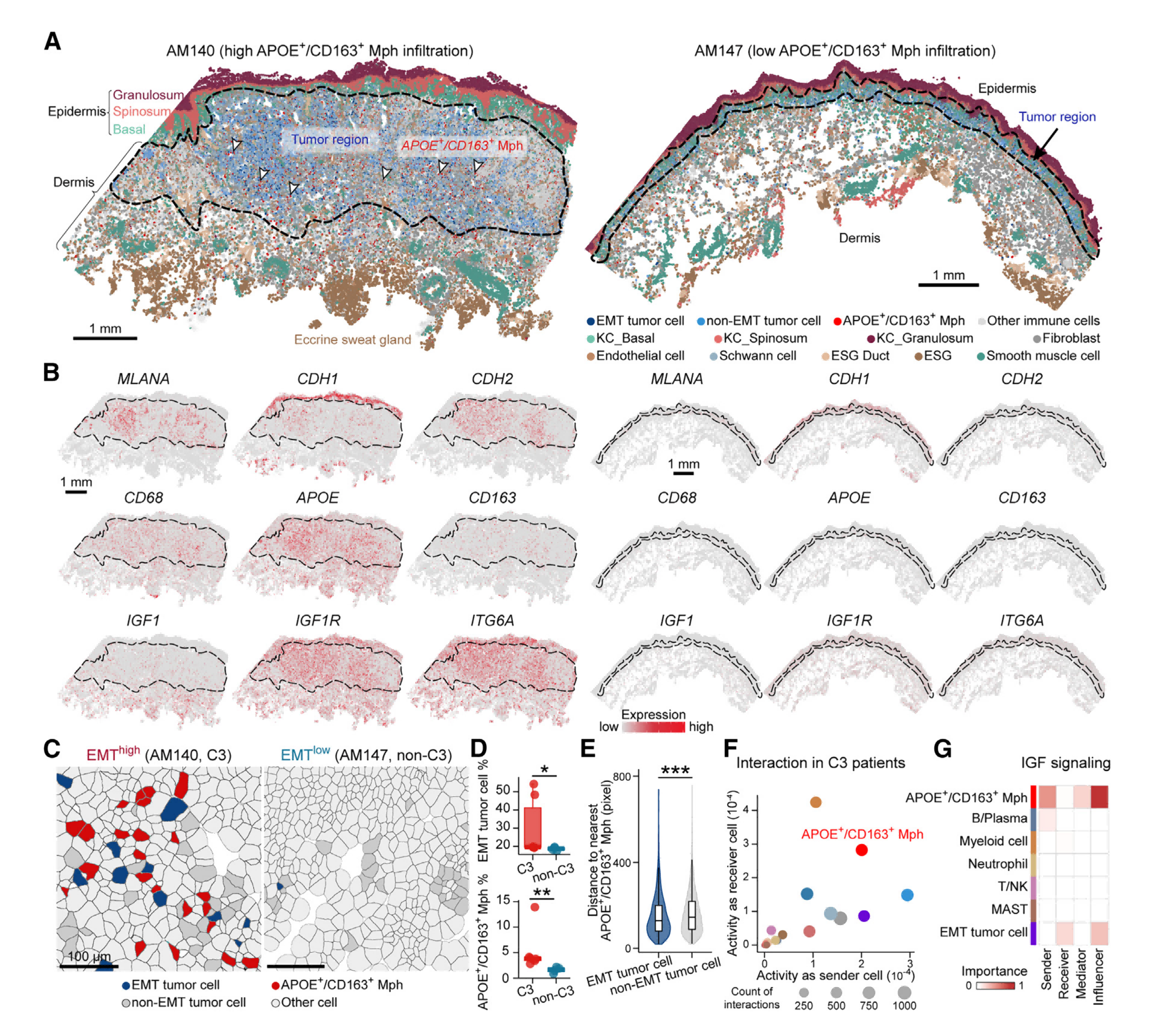 為了探索APOE+/CD163+ TAM與EMT高水平的腫瘤細(xì)胞相關(guān)作用,通過空間轉(zhuǎn)錄組測序技術(shù)(ST,BMKMANU S1000)檢測10個AM樣品。結(jié)果可清晰觀察到腫瘤組織多層結(jié)構(gòu),包括表皮層:基層、棘層和顆粒層、以及分泌汗腺的皮下結(jié)構(gòu)和血管。在C3 iAM患者中,腫瘤區(qū)域富集大量的EMT高水平的腫瘤細(xì)胞,同時也高度浸潤了APOE+/CD163+ TAM,而在非C3患者中無法發(fā)現(xiàn)這種共存。正如預(yù)期的那樣,C3患者表現(xiàn)出EMT腫瘤細(xì)胞比例明顯較高,并且APOE+/CD163+ TAM水平增高。C3患者中,在空間位置上APOE+/CD163+ TAM更接近EMT腫瘤細(xì)胞。CellChat分析顯示APOE+/CD163+ TAM作為信號發(fā)送者(配體)和接收著(受體)均表現(xiàn)出高活性,證實(shí)了其具有細(xì)胞與細(xì)胞強(qiáng)互作。與其他免疫細(xì)胞相比,APOE+/CD163+ TAM表現(xiàn)出最高水平的胰島素生長因子(IGF)信號網(wǎng)絡(luò)的發(fā)送細(xì)胞和接收細(xì)胞,這些結(jié)果揭示APOE+/CD163+ TAM和EMT腫瘤細(xì)胞在空間上的直接接觸和密切相互作用。