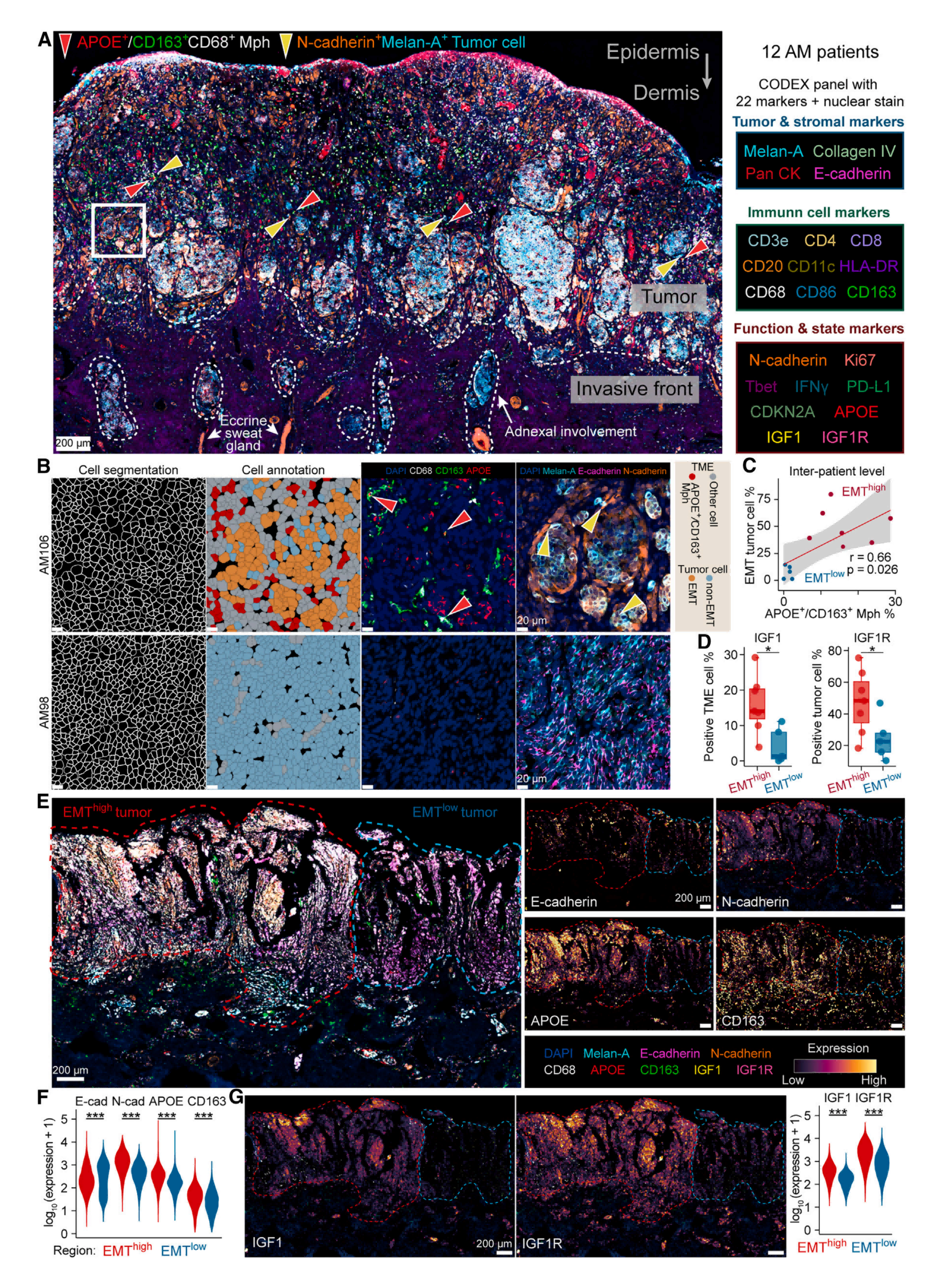 進(jìn)一步驗(yàn)證APOE+/CD163+?TAM和EMT腫瘤細(xì)胞在蛋白水平上的空間分布和相互作用,文中對12個AM樣本進(jìn)行了空間蛋白組檢測(22 plex CODEX)。其中C3患者以EMT腫瘤區(qū)域?yàn)橹?,非C3患者以非EMT腫瘤區(qū)域?yàn)橹?,結(jié)果表明APOE+/CD163+ TAM與EMT腫瘤細(xì)胞呈正相關(guān)。在C3患者中,IGF1和IGF1R的表達(dá)水平均顯著升高。APOE+/CD163+ TAM高度富集在EMThigh區(qū)域。同時IGF1和IGF1R在EMThigh區(qū)域也顯著升高。這些結(jié)果在單細(xì)胞水平和空間水平均支持APOE+/CD163+?TAM可能通過IGF1-IGF1R相互作用促進(jìn)腫瘤細(xì)胞的EMT。