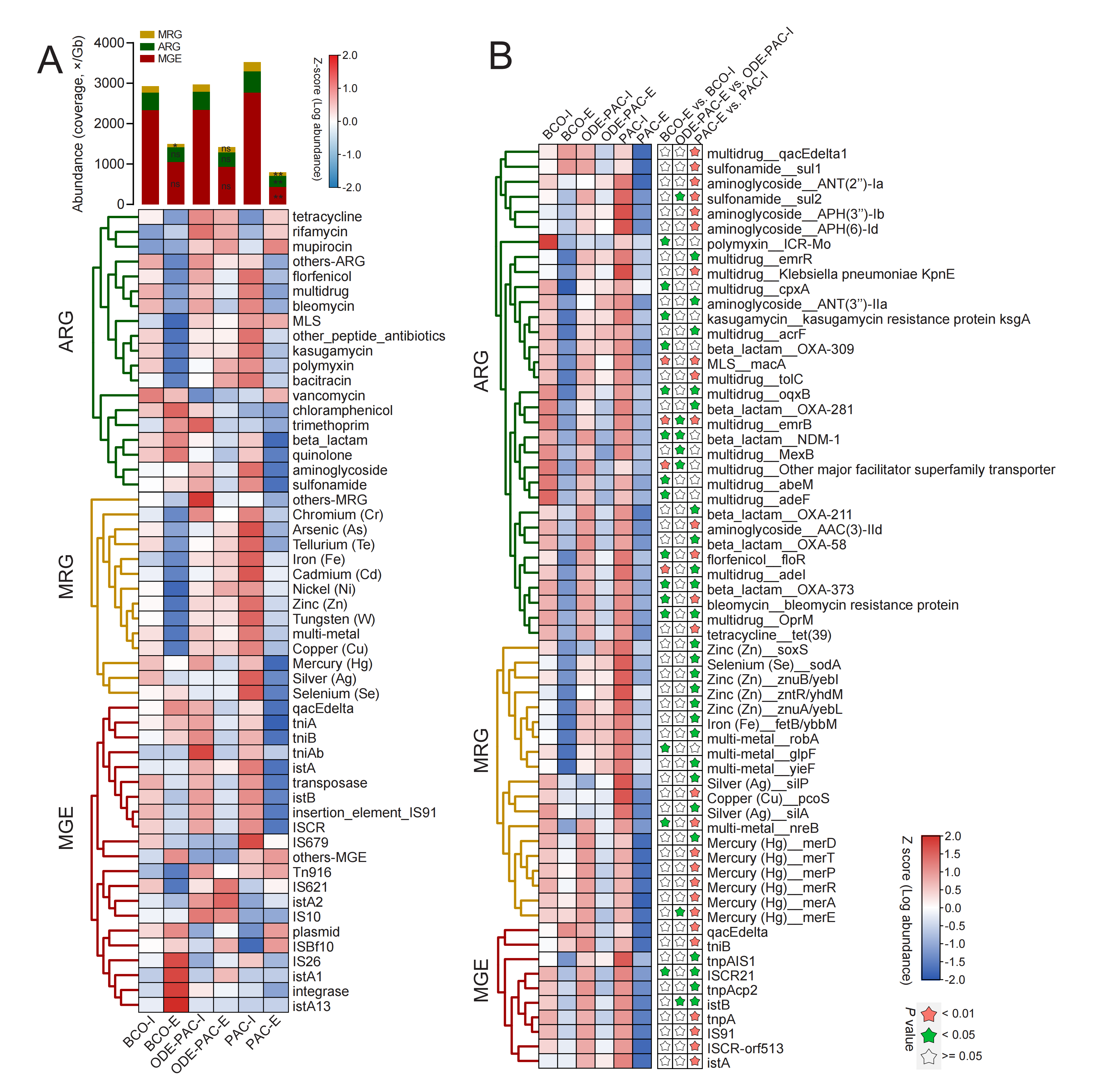 在三個(gè) HWTP 的進(jìn)水和出水中鑒定出了來自 17 個(gè) MRG 類型的 194 個(gè) MRG 亞型。在三個(gè) HWTP 的污水中,總 MRG 相對豐度始終低于進(jìn)水;然而,統(tǒng)計(jì)分析表明僅 BCO-HWTP 和 PAC-HWTP 的數(shù)據(jù)存在顯著差異(圖2A)。BCO-HWTP、ODE-PAC-HWTP和PACHWTP中MRG相對豐度的平均去除效率分別為42.08%、19.92%和57.54%。BCO-HWTP和PAC-HWTP出水中MRG的總相對豐度低于ODE-PAC-HWTP。主要的 MRG 類型包括多金屬、汞 (Hg)、銅 (Cu)、砷 (As)、鋅 (Zn)、銀 (Ag) 和鎳 (Ni)。與 BCO-HWTP 和 ODE-PAC-HWTP 相比,PAC-HWTP 中多種 MRG 類型的相對豐度在出水中低于進(jìn)水中(圖2A)。在三個(gè) HWTP 的廢水中,觀察到 19 種 MRG 的相對豐度顯著降低。具體來說,BCO-HWTP 中 2 個(gè) MRG 的減少,ODE-PAC-HWTP中 1個(gè) MRG 的減少,PAC-HWTP 中 18 個(gè) MRG 的顯著減少(圖2B)。這些結(jié)果表明,與ODEPAC-HWTP 相比,BCO-HWTP 和 PAC-HWTP 能更有效地去除 MRG。