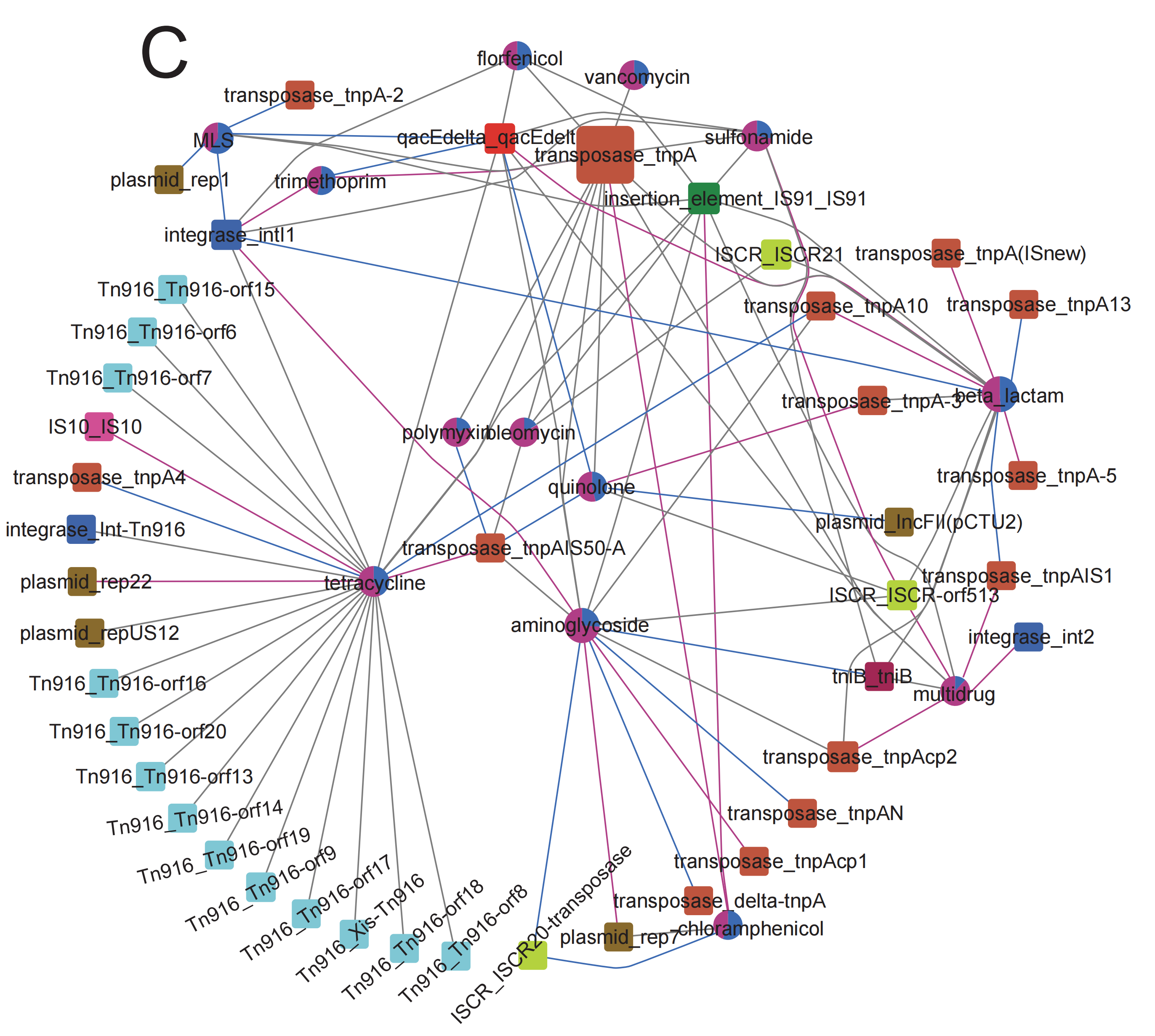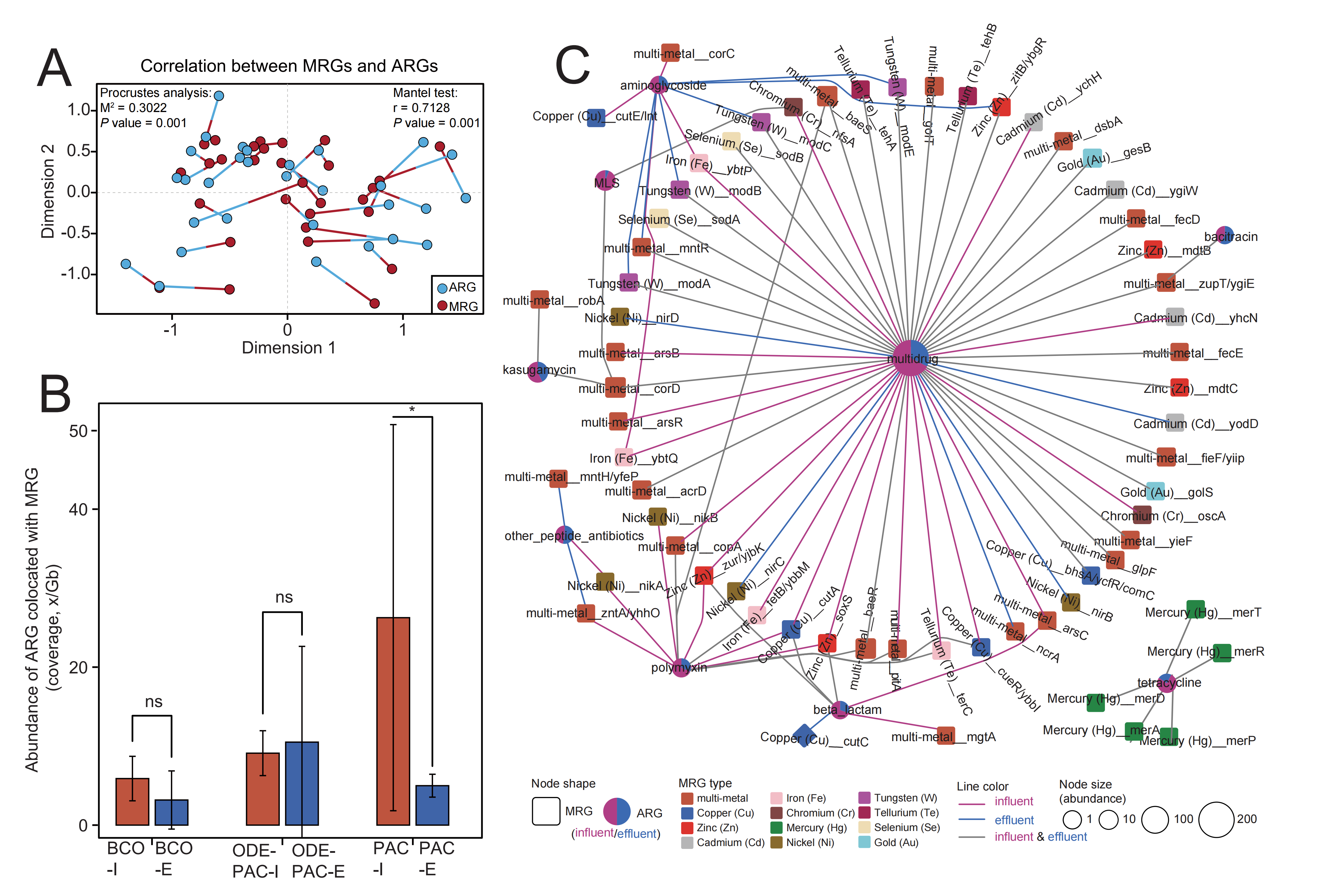 圖3-(A)Procrstes分析和Mantel檢驗(yàn)。(B)三個(gè)熱泵的進(jìn)水和出水中與MRG共存的ARG的相對豐度的差異。(C)顯示MRG和ARG類型同時(shí)出現(xiàn)的網(wǎng)絡(luò)圖。