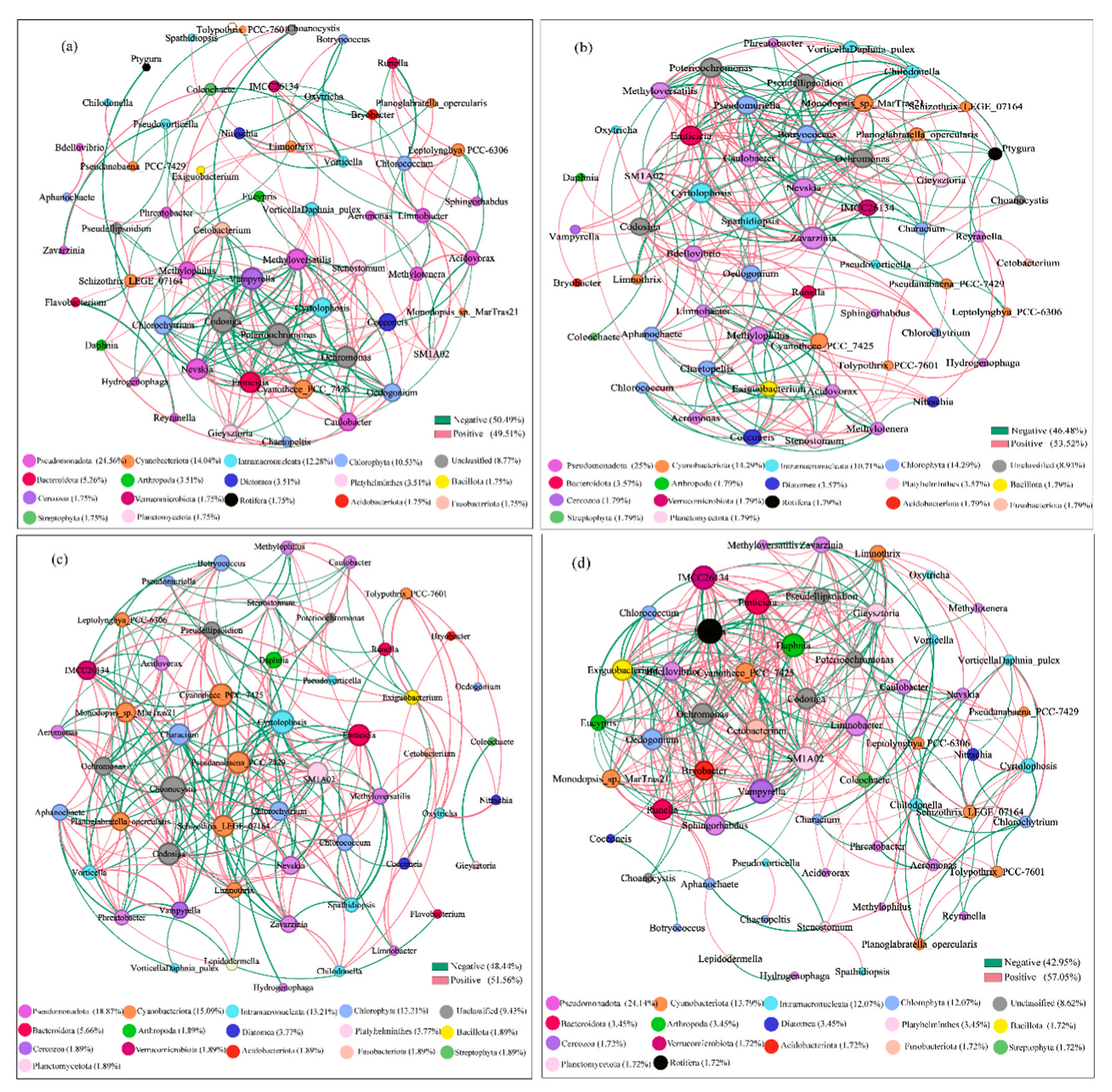 圖7-不同處理組附著生物膜中細(xì)菌和微型真核生物群落的相關(guān)網(wǎng)絡(luò)圖,(a)CK,(b)0.6 mg/L,(c)1.2 mg/L,(d)2.0 mg/L。(圓圈代表物種,同一顏色屬于同一門,圓圈的大小代表豐度;線代表兩個(gè)物種之間的相關(guān)性,線的顏色:粉紅色代表正相關(guān)性,綠色代表負(fù)相關(guān)性)。