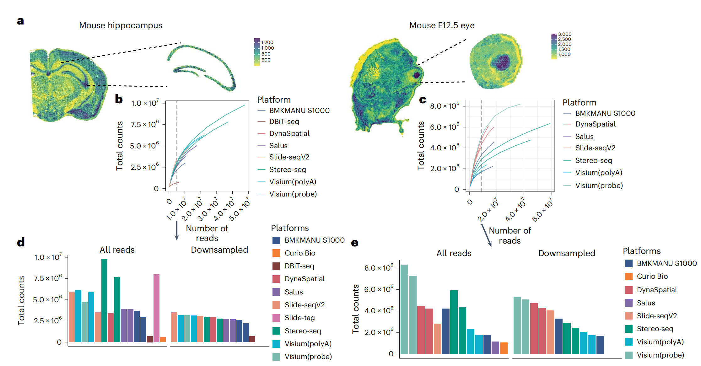 使用11種sST技術(shù),對(duì)三種組織進(jìn)行實(shí)驗(yàn),測(cè)序及分析,并對(duì)可以實(shí)現(xiàn)更高分辨率的BMKMANU S1000、Stereo-seqSlide-seqV2?在細(xì)胞級(jí)(10μm)分辨率下進(jìn)一步進(jìn)行了分析。
