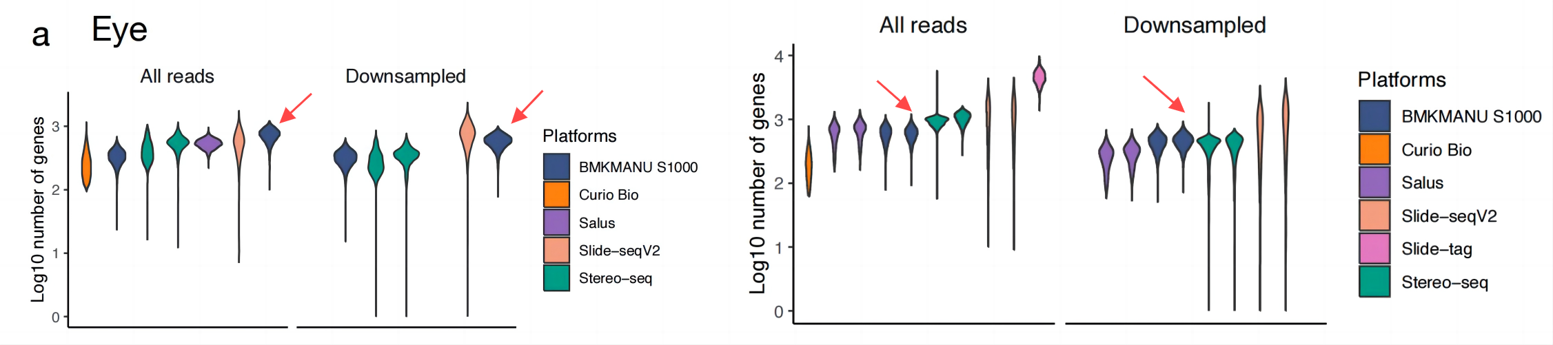 文中對(duì)visium(polyA-based)未能捕獲到的基因,在其它技術(shù)平臺(tái)中的表現(xiàn)也做了統(tǒng)計(jì),其中BMKMANU S1000、Stereo-seqSlide-seqV2都展現(xiàn)出了統(tǒng)一且全面的基因捕獲性能。