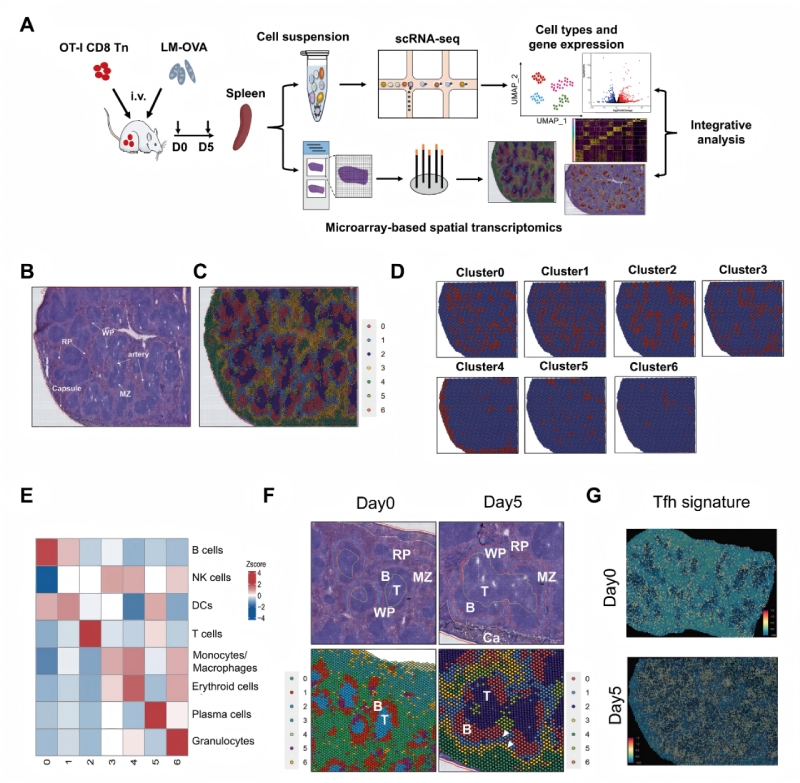 為了研究免疫反應(yīng)過程中不同免疫細胞的空間分布和CD8+?T細胞分化的調(diào)節(jié)機制,研究人員通過整合單細胞RNA測序(scRNA-seq)和BMKMANU?S1000空間轉(zhuǎn)錄組(ST)技術(shù),分析了急性感染模型中脾臟免疫細胞的空間分布與CD8??T細胞分化機制。實驗采用OT-I轉(zhuǎn)基因小鼠模型,通過李斯特菌(LM-OVA)感染誘導(dǎo)免疫反應(yīng),關(guān)鍵發(fā)現(xiàn)包括:1)脾臟形成7個功能集群(B細胞、T細胞、單核/巨噬細胞等);2)感染后T/B細胞區(qū)擴大,APCs(B細胞、DC、巨噬細胞)在T細胞區(qū)外圍聚集;3)空間重組與T細胞分化(MP/TE亞群)顯著相關(guān)。多組學(xué)整合揭示了免疫微環(huán)境的動態(tài)調(diào)控機制,為理解感染中細胞互作提供了多組學(xué)視角。