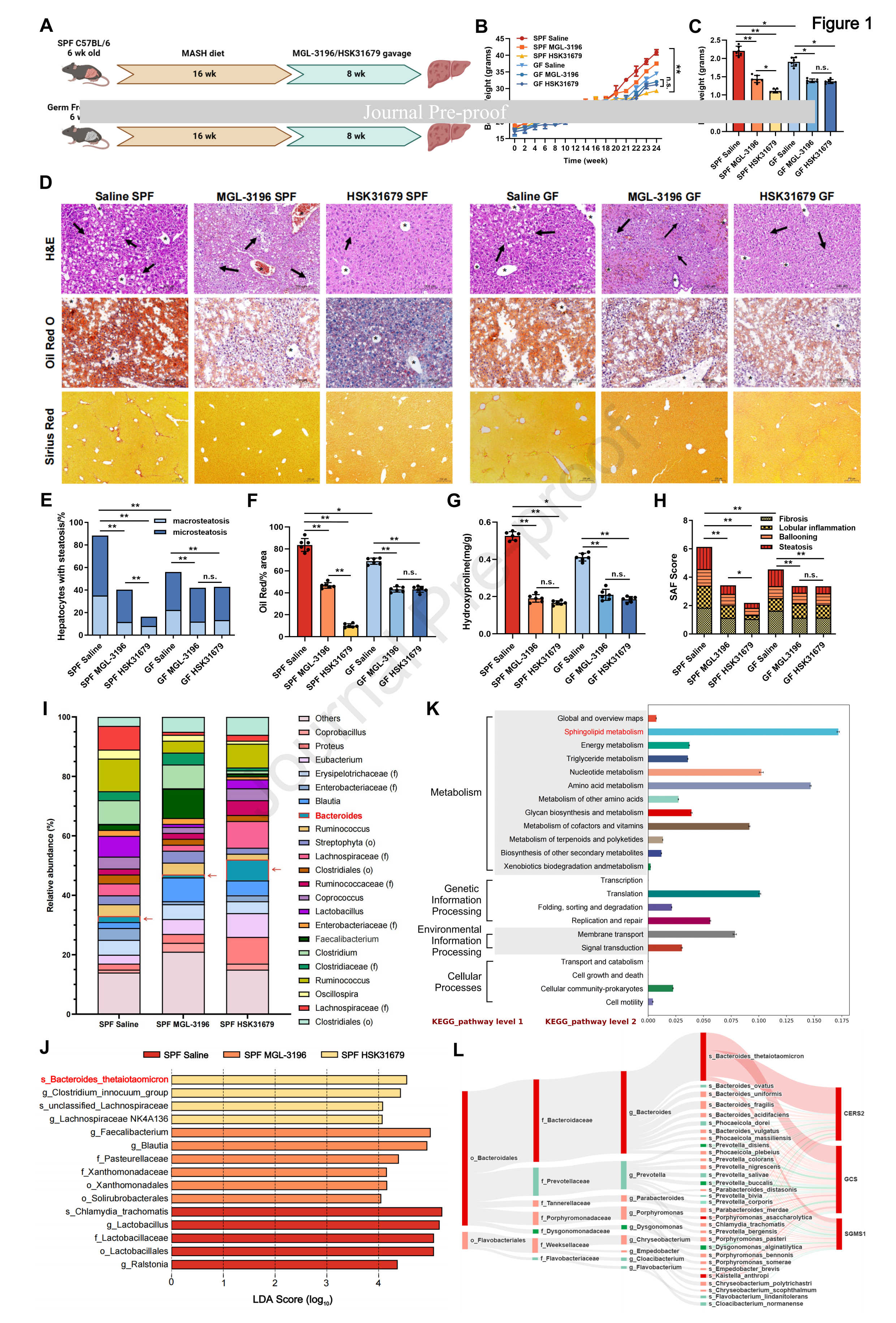 為了研究THR-β激動劑治療 MASH對腸道微生物群的影響,研究者在沒有腸道微生物定群的情況下飼養(yǎng)的C57 BL/6 GF小鼠喂食高脂肪、果糖和膽固醇飲食(MASH飲食)和SPF對照組16周。然后每日給予MGL-3196或HSK 31679 3毫克/kg劑量,口服,持續(xù)8周(圖1A)。如圖1B所示,MGL-3196灌胃對SPF和GF小鼠的體重均沒有明顯影響,而HSK 31679導(dǎo)致SPF小鼠的體重增加具有統(tǒng)計學(xué)意義,但GF小鼠沒有。服用MASH飲食然后接受MGL- 243 3196/HSK 31679處理的SPF小鼠表現(xiàn)出肝臟重量明顯下降(p < 0.01;圖1C),HSK31679 組 SPF 小鼠的體重增加、肝臟重量、血清和肝臟甘油三酯和膽固醇水平、血清 ALT、AST 和 GGT 水平以及肝臟脂質(zhì)變性程度均顯著低于 MGL-3196 組。HSK31679 組 SPF 小鼠的肝臟炎癥和纖維化相關(guān)基因表達水平也顯著低于 MGL-3196 組。無菌小鼠模型中,MGL-3196 和 HSK31679 組的 MASH 病理表現(xiàn)相似,表明 HSK31679 的療效依賴于腸道菌群。