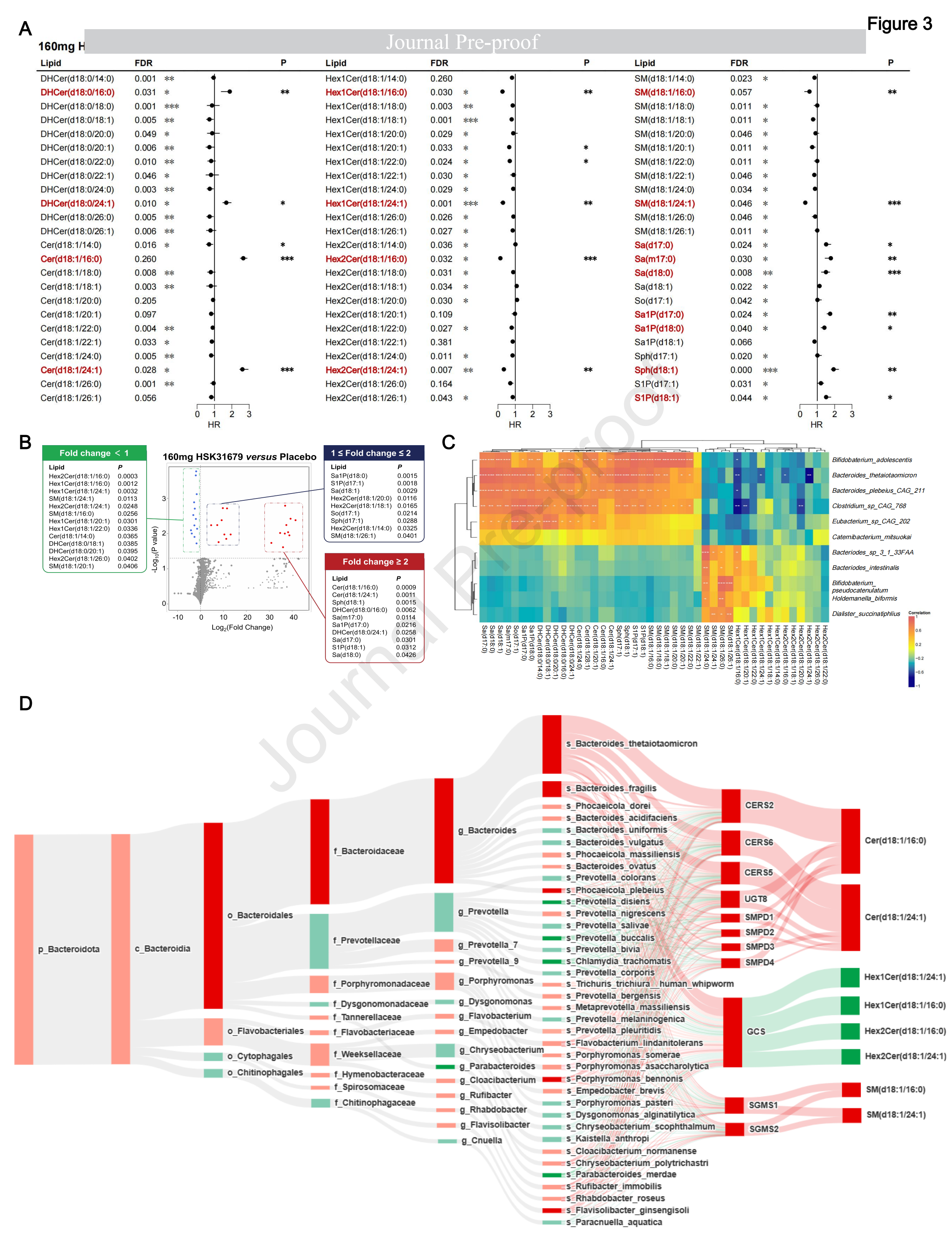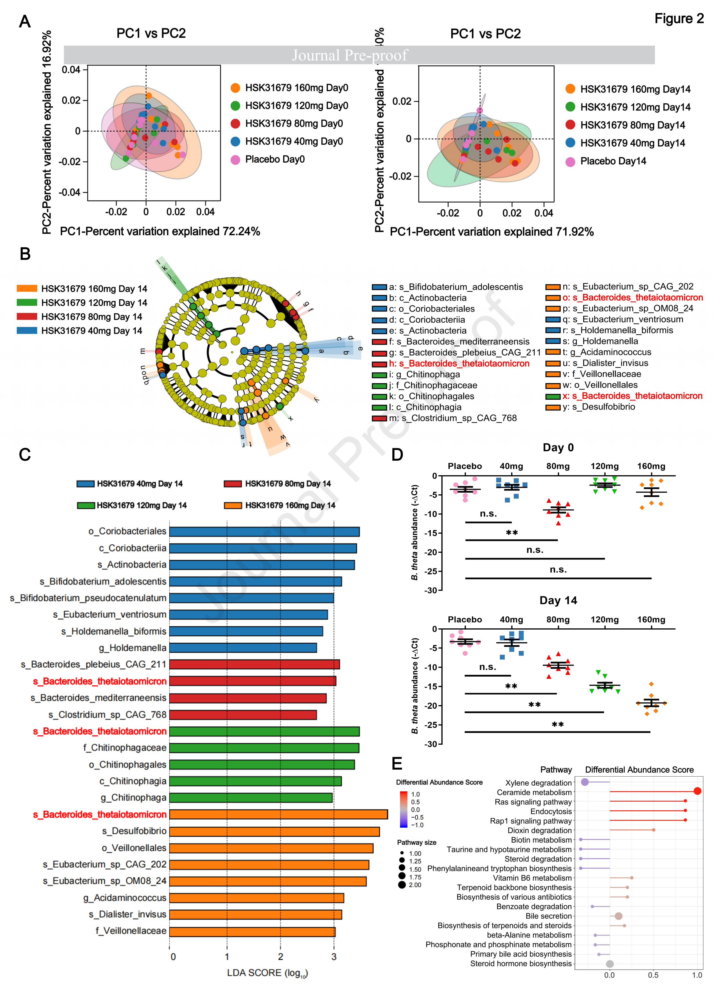 隨后通過LEfSe分析探索了HSK31679治療組14天與安慰劑組相比的腸道菌群差異,這進一步揭示了桿菌屬的最大增量(圖2B,C)。值得注意的是,在第14天上升劑量為80mg、120mg、160mg HSK31679后,B. thetaiotaomicron的相對豐度表現(xiàn)出最明顯的逐漸上升(圖2C),并通過qPCR進行了驗證(圖2D),這表明B.thetaiotaomicron可能在HSK31679治療期間發(fā)揮關(guān)鍵中介作用。KEGG通路分析富集了20個信號通路的154個功能基因,其中神經(jīng)酰胺代謝被HSK31679處理激活(圖2E)。這些顯著的成分變化與以前對晚期脂肪性肝炎患者微生物種群負(fù)相關(guān)的研究一致。